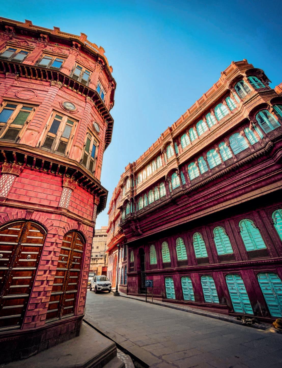 Bikaner's rich history is revealed in its brilliant architecture. The 15th-century, red-hued Rampuria Group of Havelis (facing page), for instance, is not just an icon of heritage but also a living embodiment of the exquisite artistry of the time. The desert city's claim to fame also includes a special breed of camels. Bikaner hosts a grand camel festival every January, featuring magnificent processions of decorated camels (above). On the city's outskirts lies one of the largest camel research and breeding farms in the world.