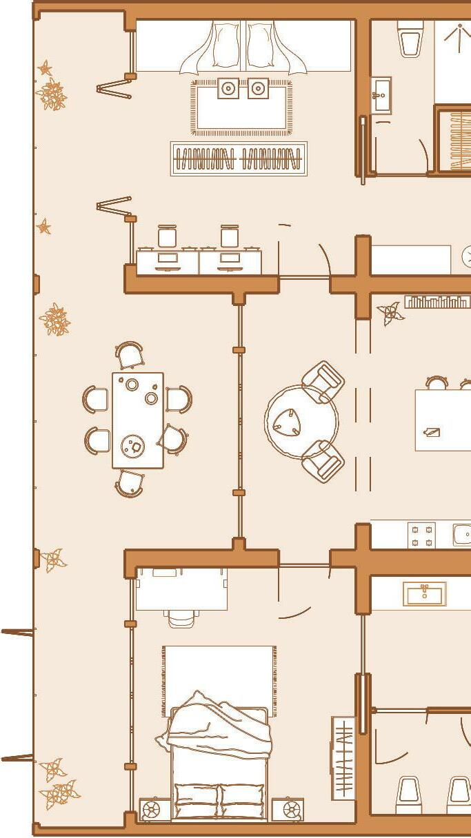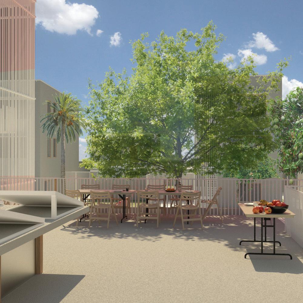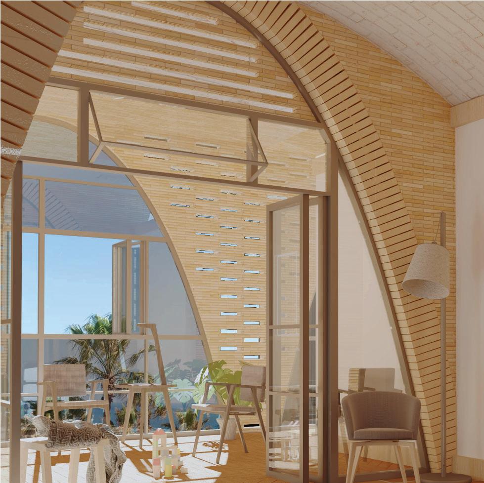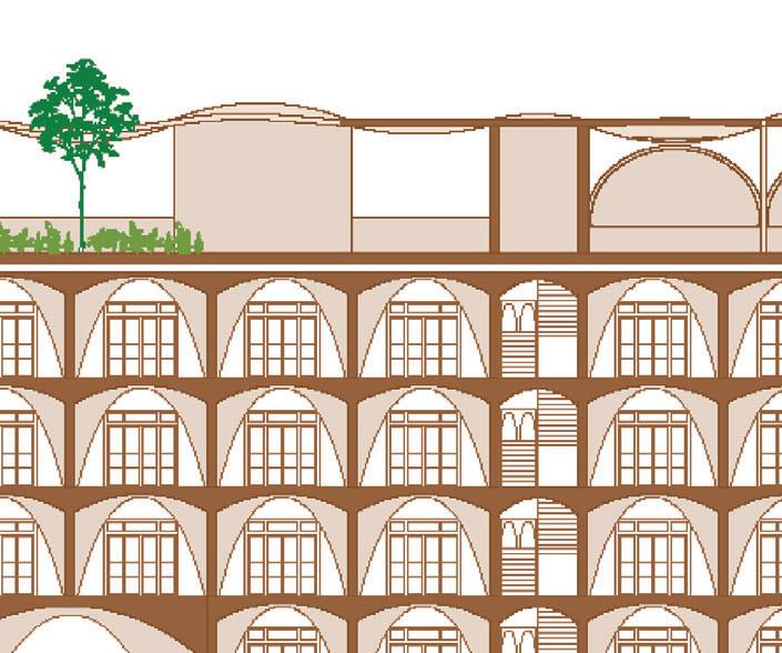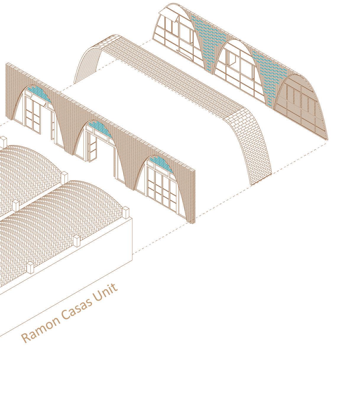 A typical 3 bedroom unit with the main functions of living in the central vaulted areas and the layered galleria spaces which allow for flexible uses depending on adjacencies, seasonality, and individuality. Catalan vaults provide an intimate sense of materiality in the interior spaces, while the gallerias provide ventilation, solar shading, privacy, and domesticity.