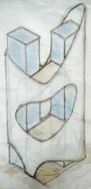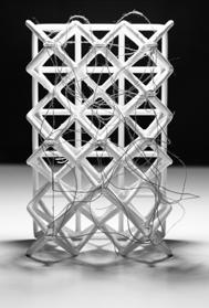 Human skin contains multiple layers of different types of cells to form the protective outer layer of out bodies. This modular design takes inspiration from the geometry within the layers as they shift from very stiff, brick-and-mortar geometry to a more randomized and flowing geometry to finally completely random form. The topmost layer, containing corneocytes, or the dead skin cells, overlap in a firm, fairly set pattern, to form a protective layer. This geometry inspired me to create a very geometric and strong structural module as the first layer. The next cell are the keratinocytes, which are much more fluid and open in their geometry, leading to a more open, curvy shape for the second module, with more gaps allowed in the overall configuration. The third module comes from the elastic mucus of the dermis, completely random and stringy in form, and is represented in the strings attached to the tips of the second module, completely loose and fluid in form.