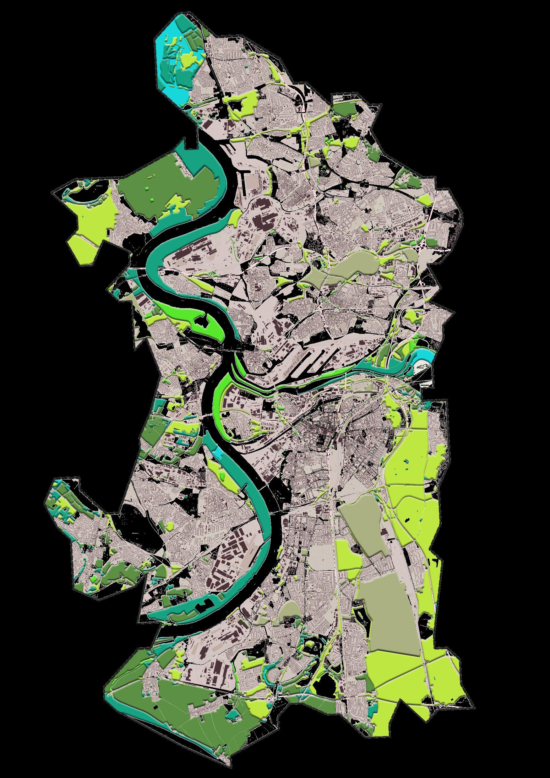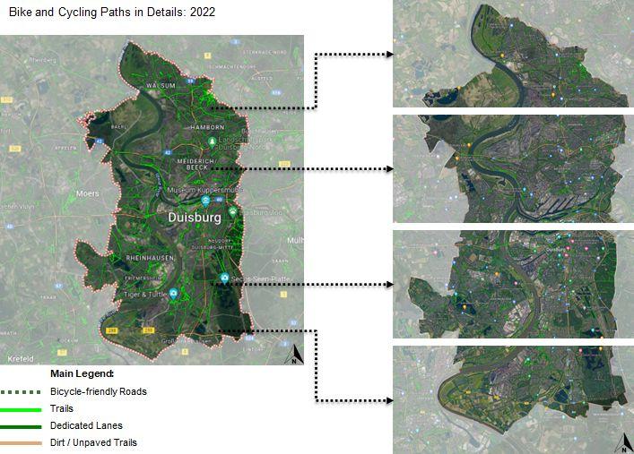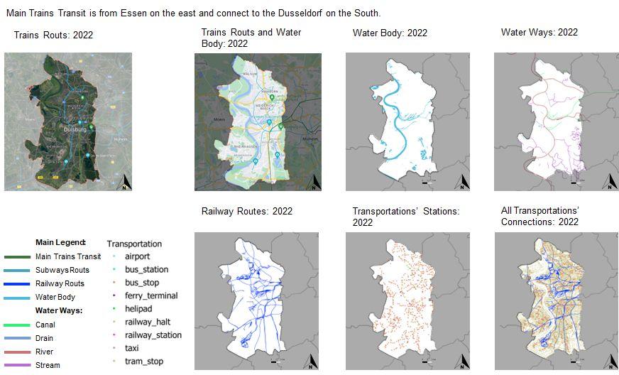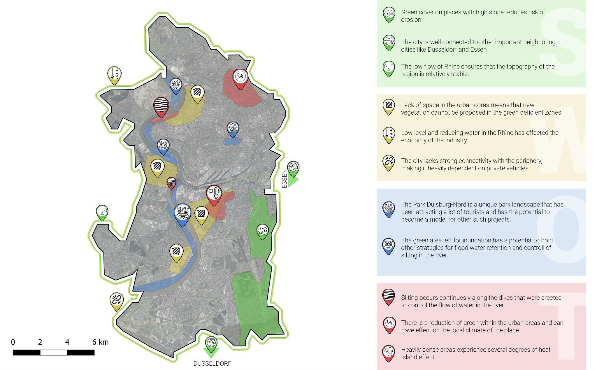 Duisburg is the only city of the Rhine-Ruhr region lying on both the Rhine and Ruhr rivers.The city spreads along both sides of these rivers. The main issues we found are the vegetation loss, flood risks and traffic orientated urban area.
