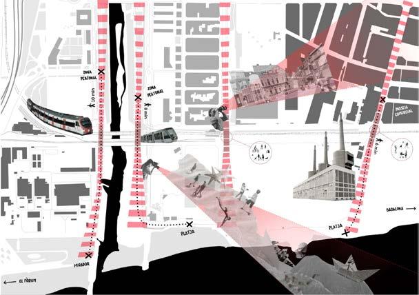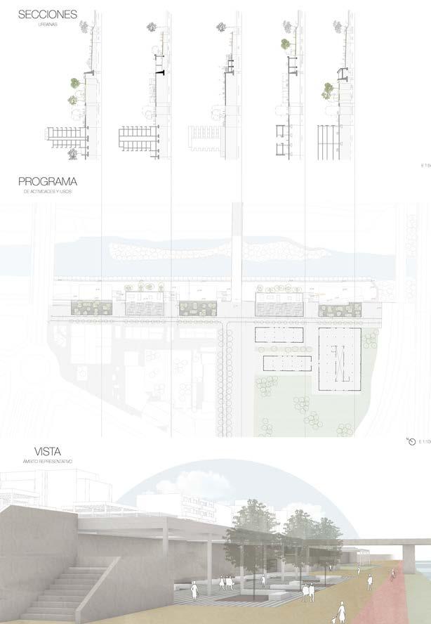 Es planteja la superació d’aquestes vies a través d’un sistema de “plataformes aèries habitables” que permeten mantenir la circulació del transport públic i crear l’accés a nous espais públics pels peatons en un nivell més elevat. S’aprofiten aquestes noves superfícies per establir un programa sistematitzat i fomentar l’activitat, extenent així l’equipament d’un cantó a l’altre.