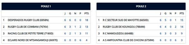 RC Secteur sud de Mayotte Bouéni 40–36 Rugby club de Combani Desperados rugby club 65–14 Rugby club de Koungou