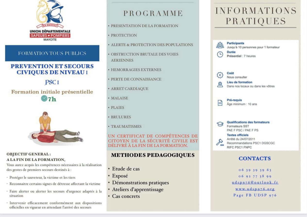 L’Union départementale des sapeurs-pompiers de Mayotte (UDSP) propose une formation de secourisme le mardi 6 juin à la caserne de Kawéni. C’est l’occasion pour les Mahorais et les Mahoraises de s’initier par groupe de dix aux gestes de premiers secours, aux côtés de professionnels. Pour 60 euros, les volontaires apprennent à venir en aide aux personnes blessées et potentiellement en danger. À la fin de la journée, un certificat « Prévention et secours civique » de niveau 1, reconnu par l’État, sera remis aux participants. Pour toute information supplémentaire, contactez l’UDSP de Mayotte par mail (UDSP976@outlook.fr) ou par téléphone (06 39 39 39 63 ou 06 92 77 38 99).