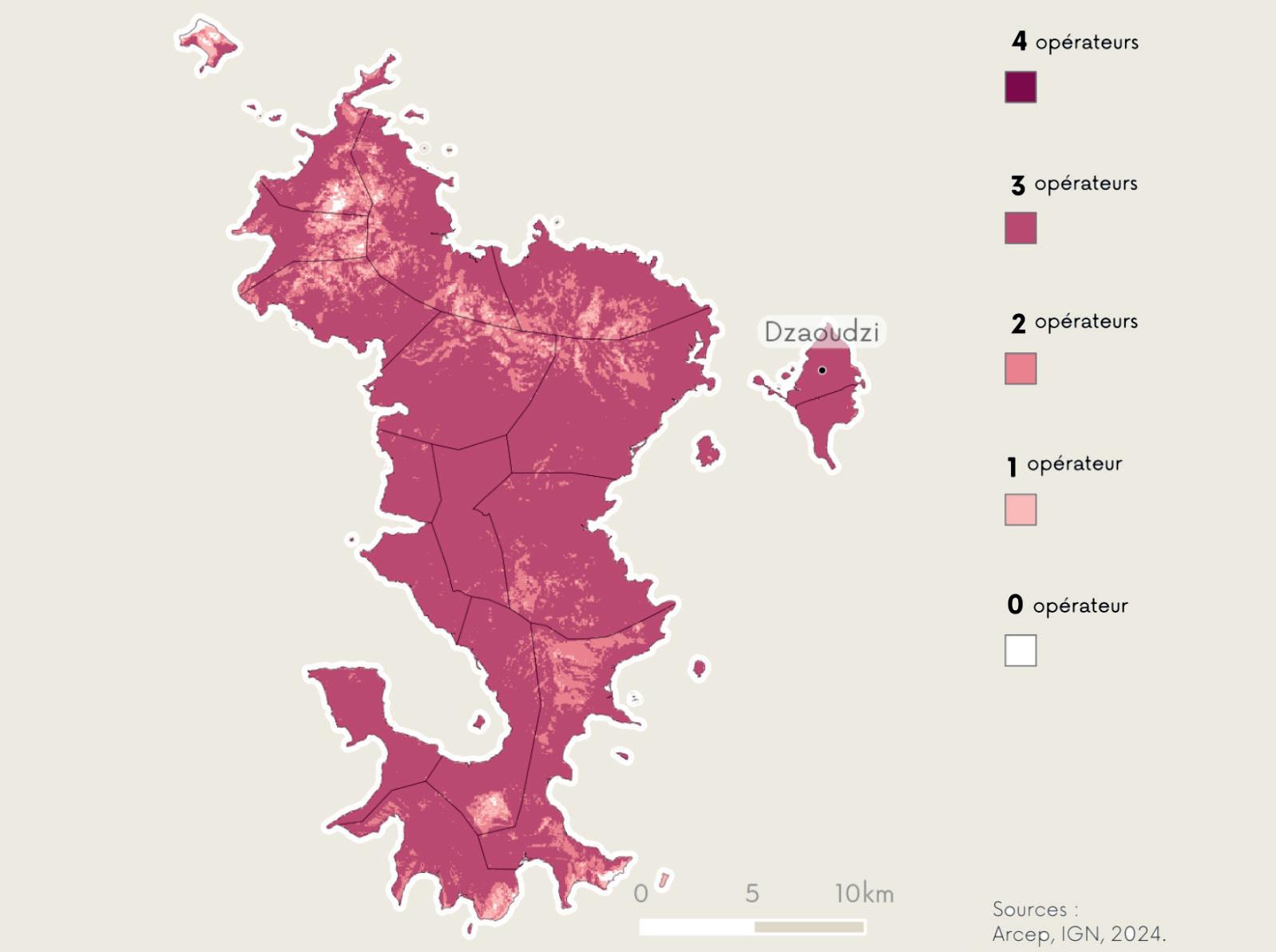 À Mayotte, les infrastructures télécoms restent limitées. Actuellement, tous les sites télécoms de l’île disposent de la 4G, couvrant 99,9 % de la population. Cependant, la qualité du service mobile reste inégale