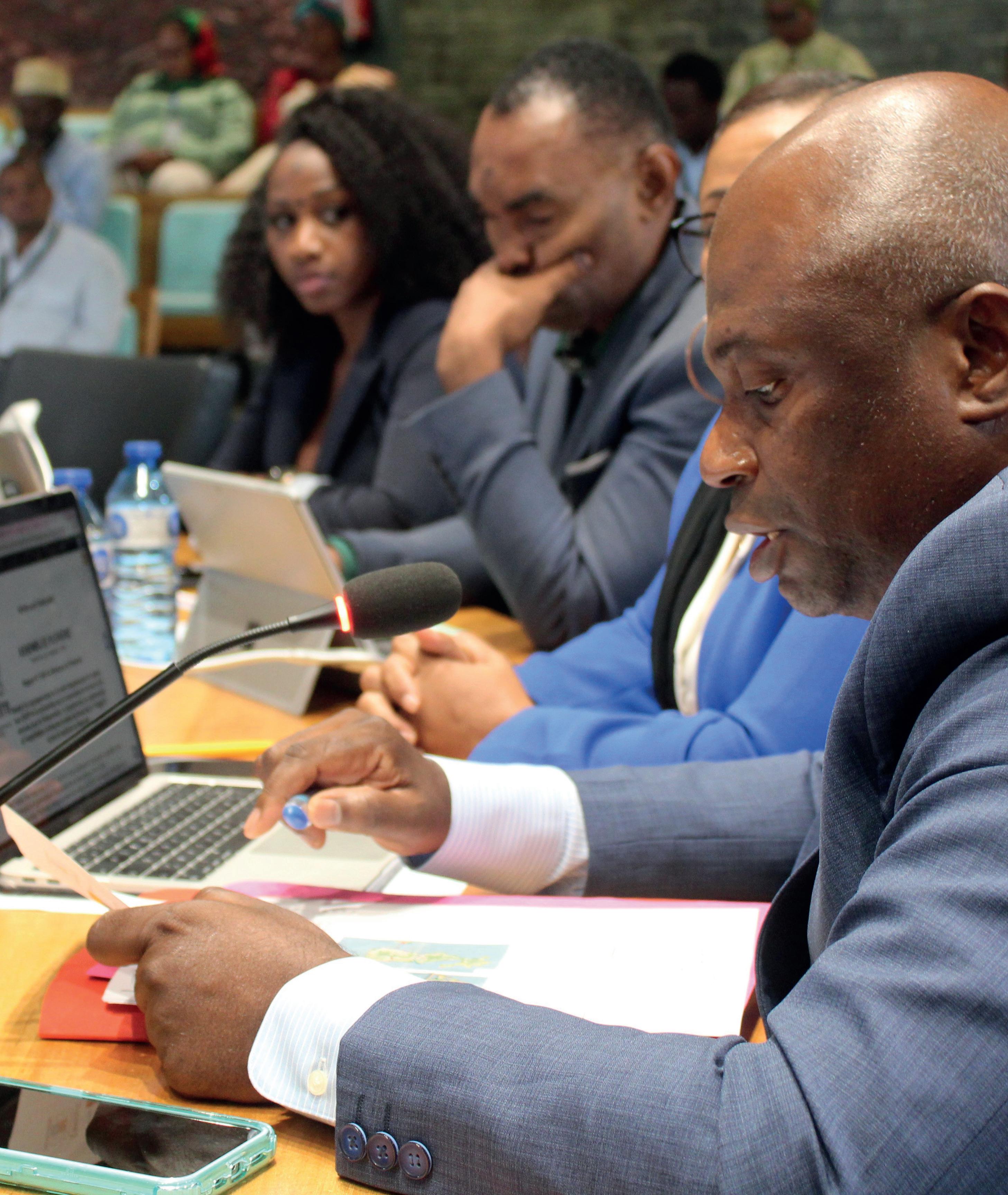 Saindou Attoumani, conseiller départemental du canton de Ouangani, en charge de l’aménagement, présente le rapport sur la convention avec Zeop, vendredi 22 novembre, dans l’hémicycle Younoussa-Bamana.