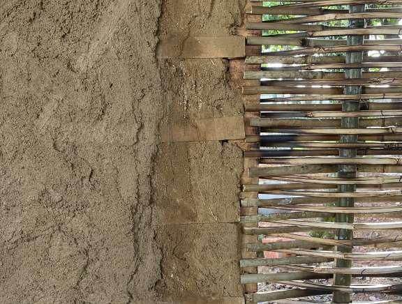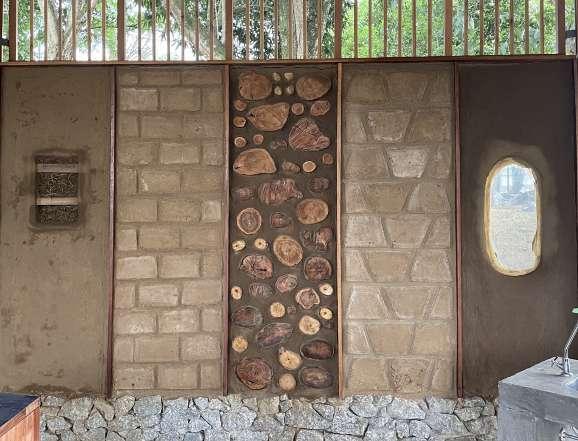 parede de taipa de pilão parede de mostruário de técnicas de bioconstrução: taipa leve, adobe, cordwood, adobe africano e cob