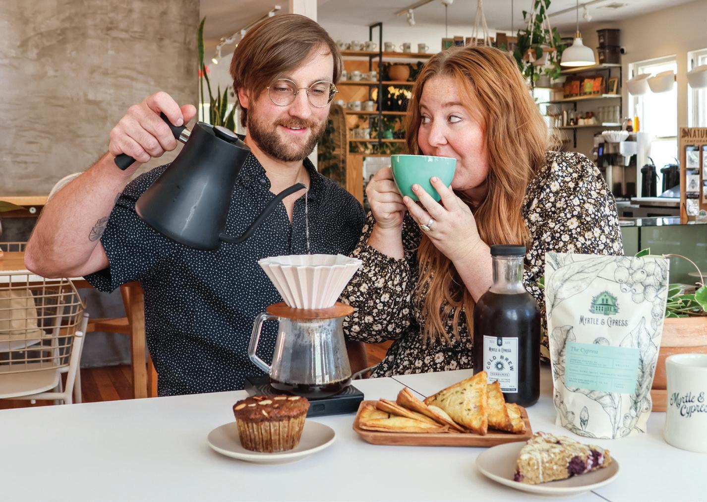- ERIC PURCELL, CO-OWNER, MYRTLE & CYPRESS COFFEEHOUSECO-OWNERS BRANDON AND MEGAN SPERRY WITH GOODS MADE IN-STORE, INCLUDING GLUTEN-FREE PASTRIES. CO-OWNERS ERIC AND LISA PURCELL. BRANDON SPERRY POURS LATTE ART.