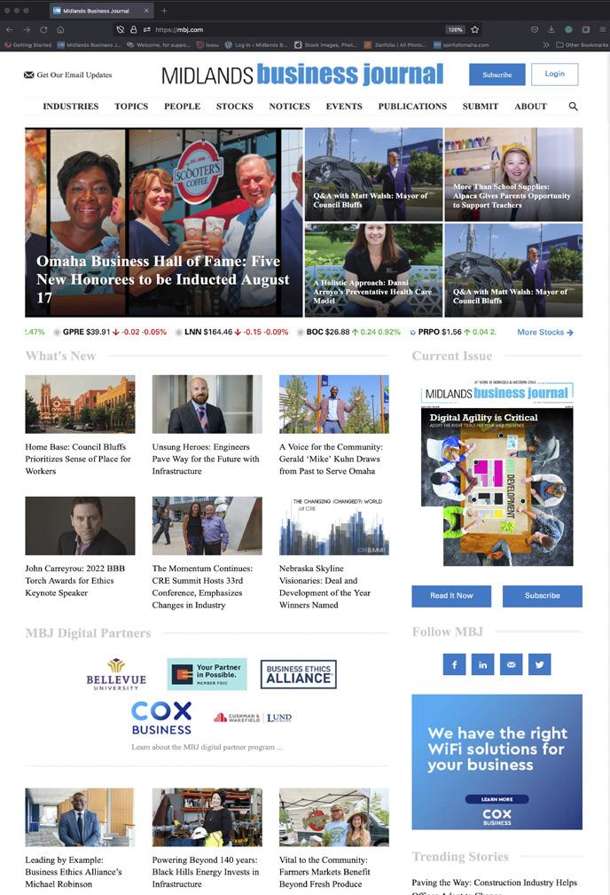 The Midlands Business Journal (ISSN 01944525) is published weekly plus one by MBJ Inc. and is available for $2.00 per individual copy or $84 per year. Editorial offices are 1308 S. 119th St., Omaha, NE 68144. Periodical postage paid at Omaha NE POSTMASTER; Send address changes to Midlands Business Journal, 1308 S. 119th St., Omaha, NE 68144. All submissions to the Midlands Business Journal become the property of the Midlands Business Journal and will not be returned. EDITORIAL ADVERTISING