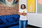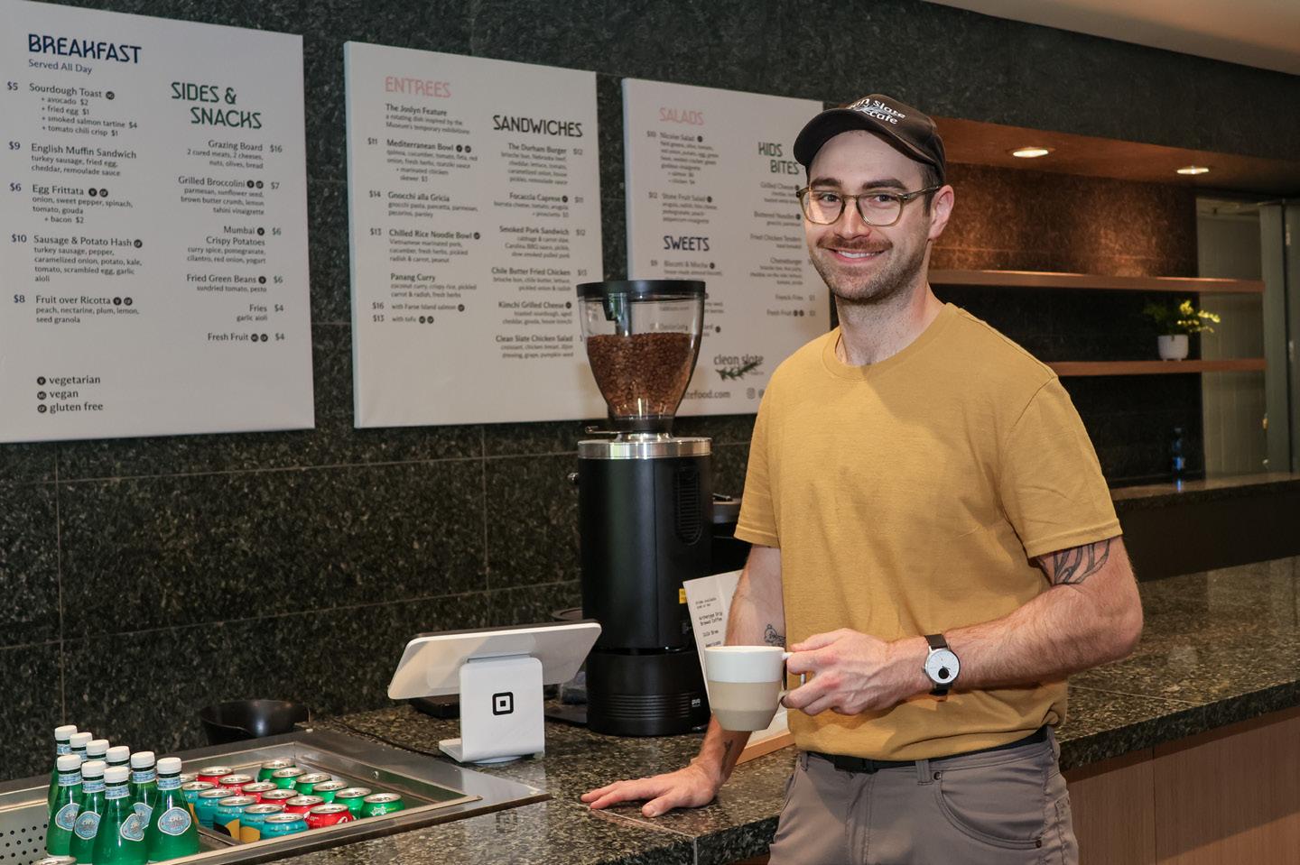 CO-FOUNDER DYLAN THOMPSON IN THE CAFÉ, WHICH HAS A FULL-SERVICE COFFEE BAR SERVING COFFEE FROM LOCAL ROASTER