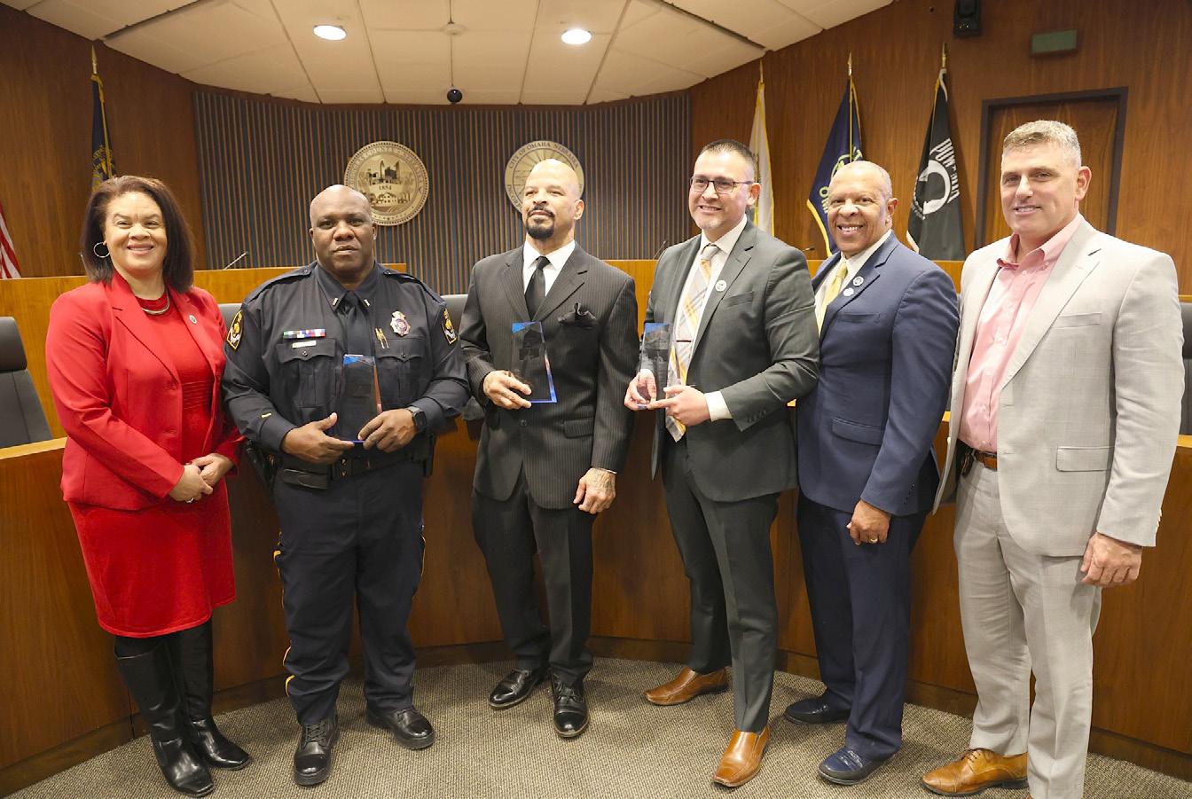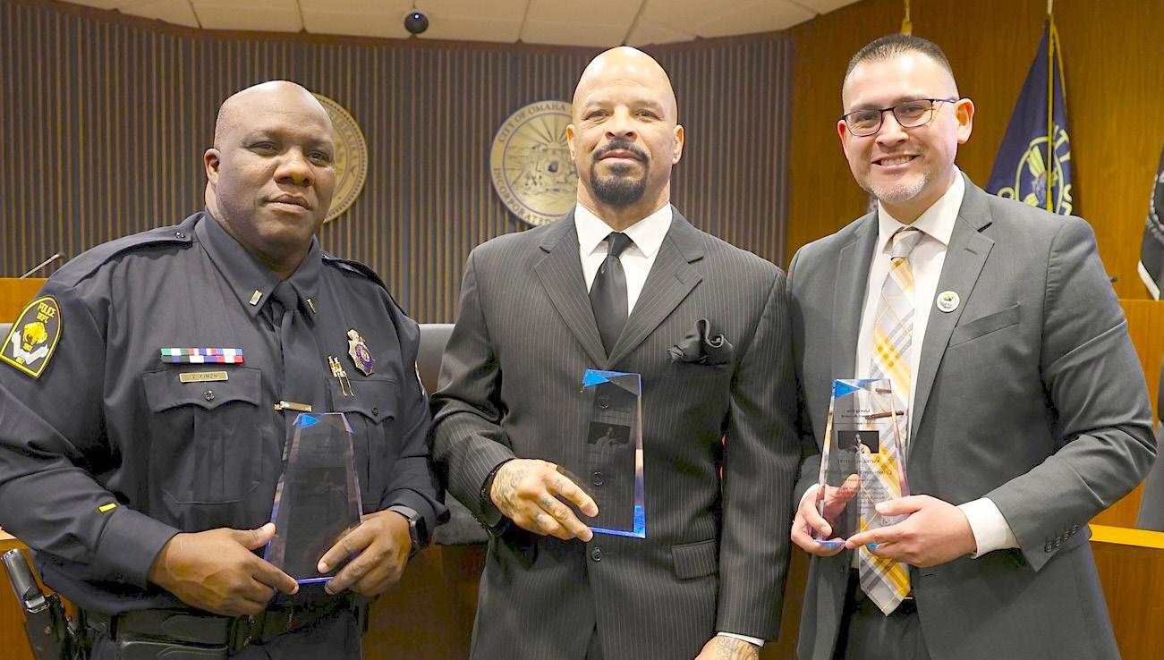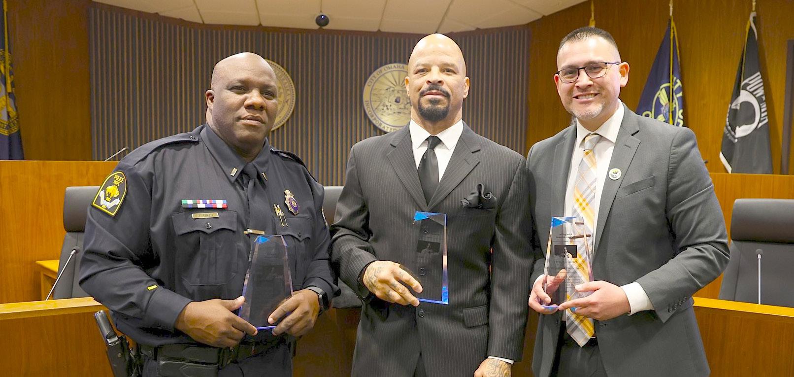 AWARD WINNERS LT. ANTWONE FINCH, HOUSTON ALEXANDER AND ROGER GARCIA WITH LAVONYA GOODWIN, MAYOR JOHN EWING AND OPD CHIEF TODD SCHMADERER