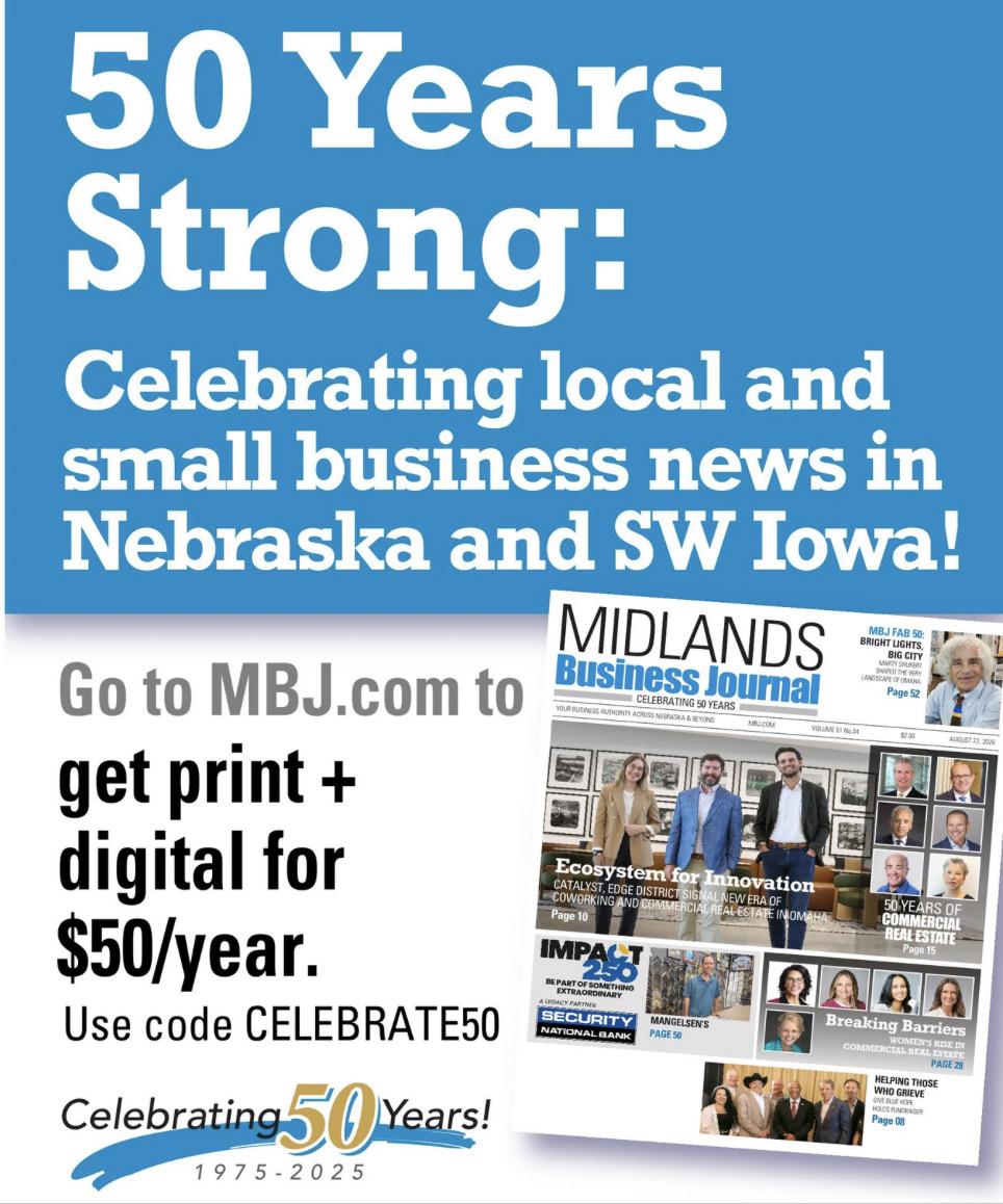The Midlands Business Journal (ISSN 0194-4525) is published weekly by MBJ Inc. and is available for $2.00 per individual copy, $84 per year (print subscription) or $60 (digital only). Editorial offices are 1308 S. 119th St., Omaha, NE 68144. Periodical postage paid at Omaha NE POSTMASTER; Send address changes to Midlands Business Journal, 1308 S. 119th St., Omaha, NE 68144. All submissions to the Midlands Business Journal become the property of the Midlands Business Journal and will not be returned. EDITORIAL ADVERTISING (402) 330-1760