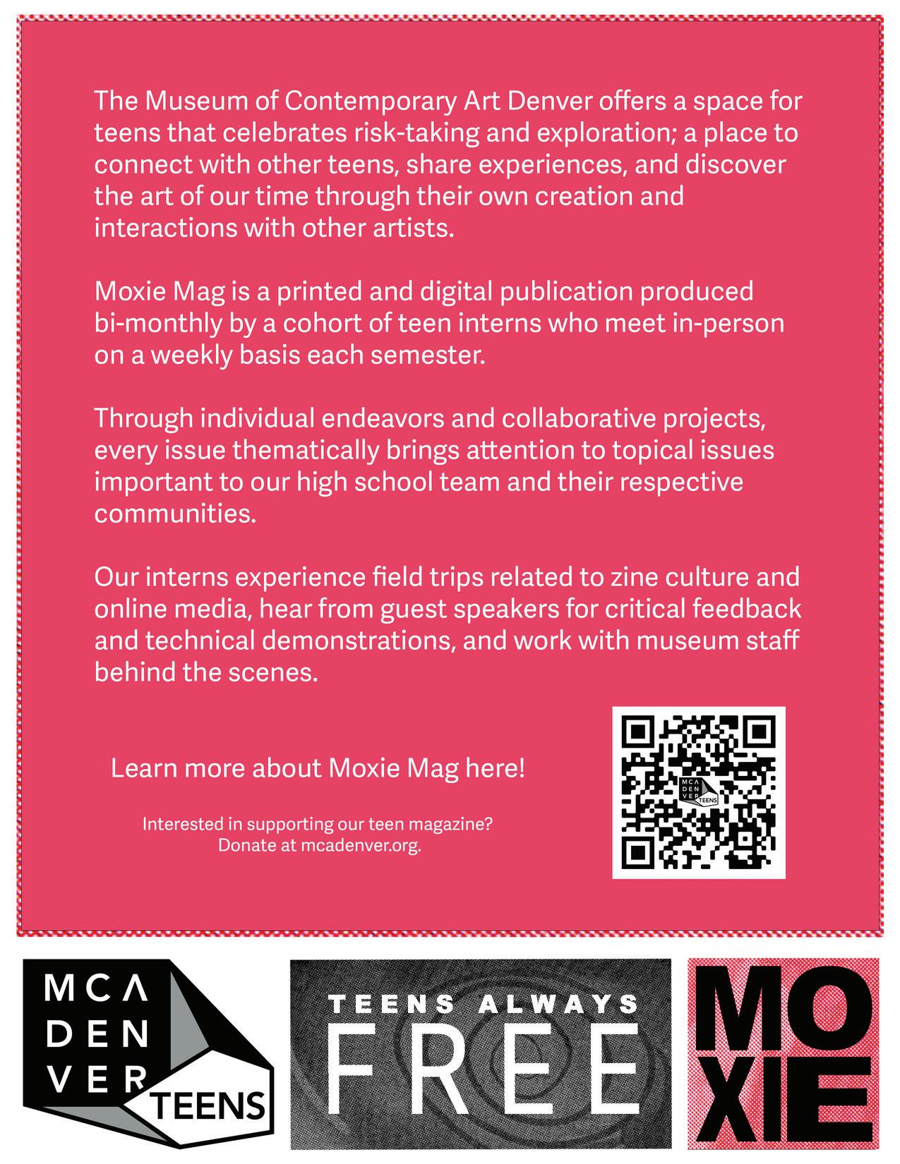 MoxieMag is a printed and digital publication produced monthly by a cohort of teen interns who meet in-person on a weekly basis each semester.