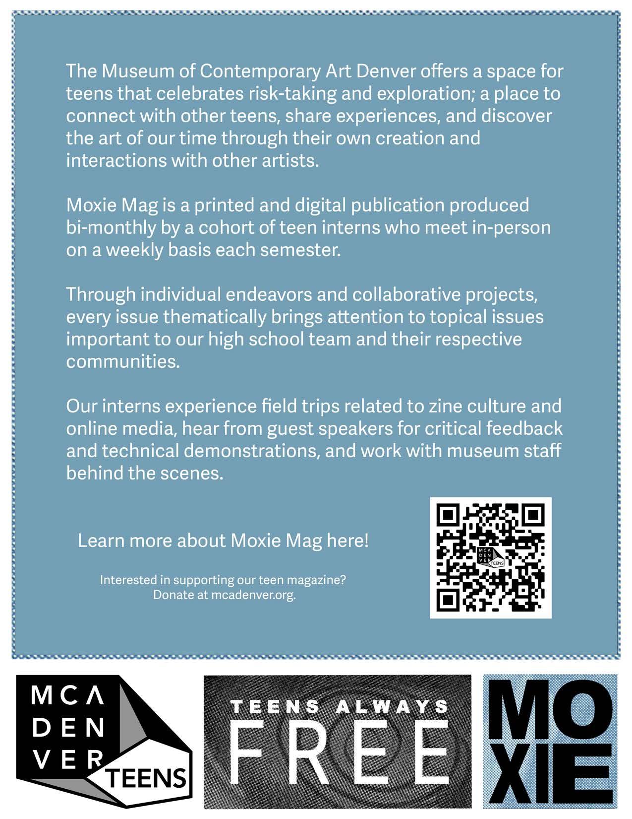 Moxie Mag is a printed and digital publication produced monthly by a cohort of teen interns who meet in-person on a weekly basis each semester.