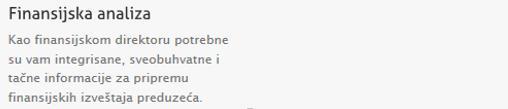 o Fin. analize o Prodaja o Nabavka o Potraživanja o Dugovanja o Projekti o Zalihe o HR i zarade o ...