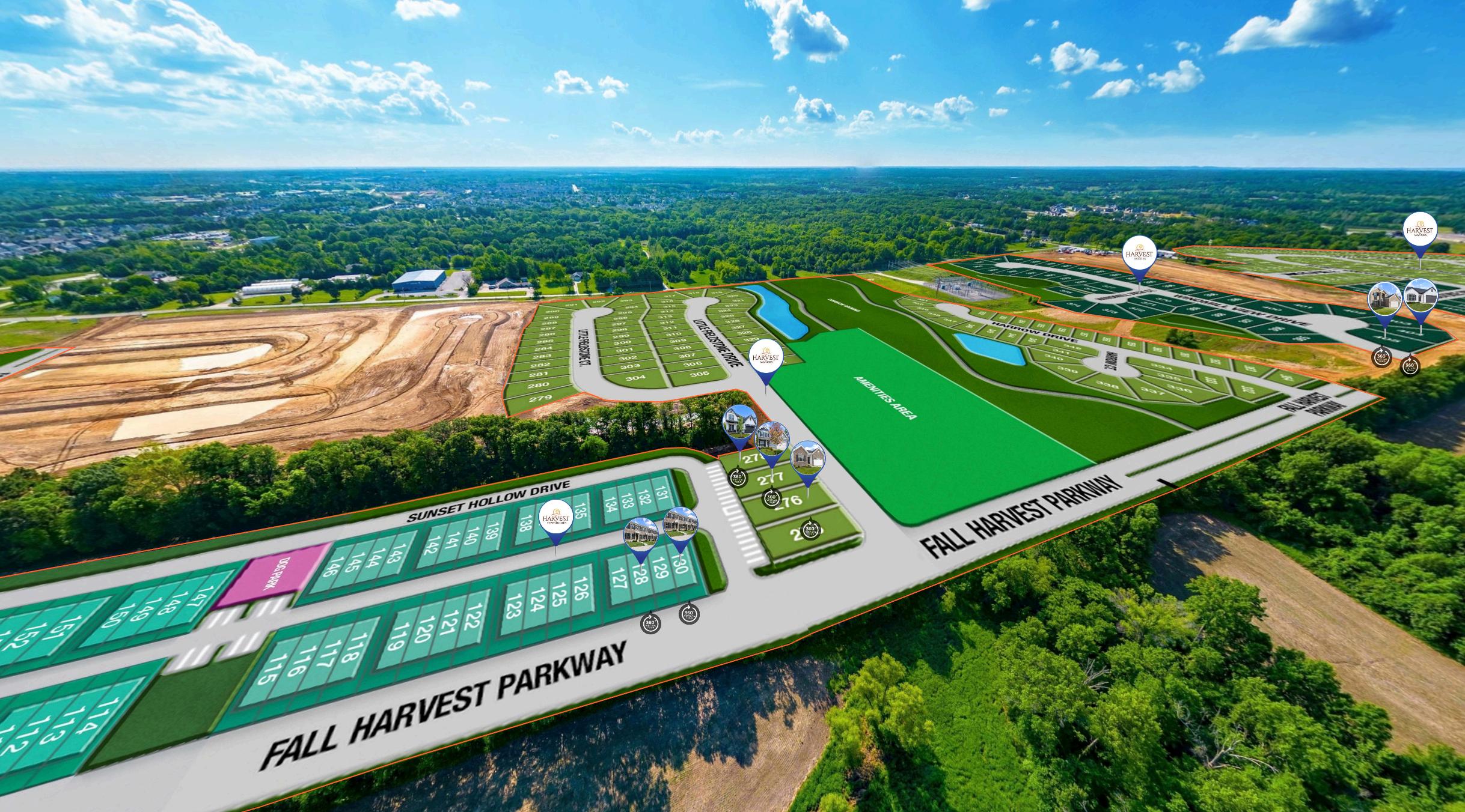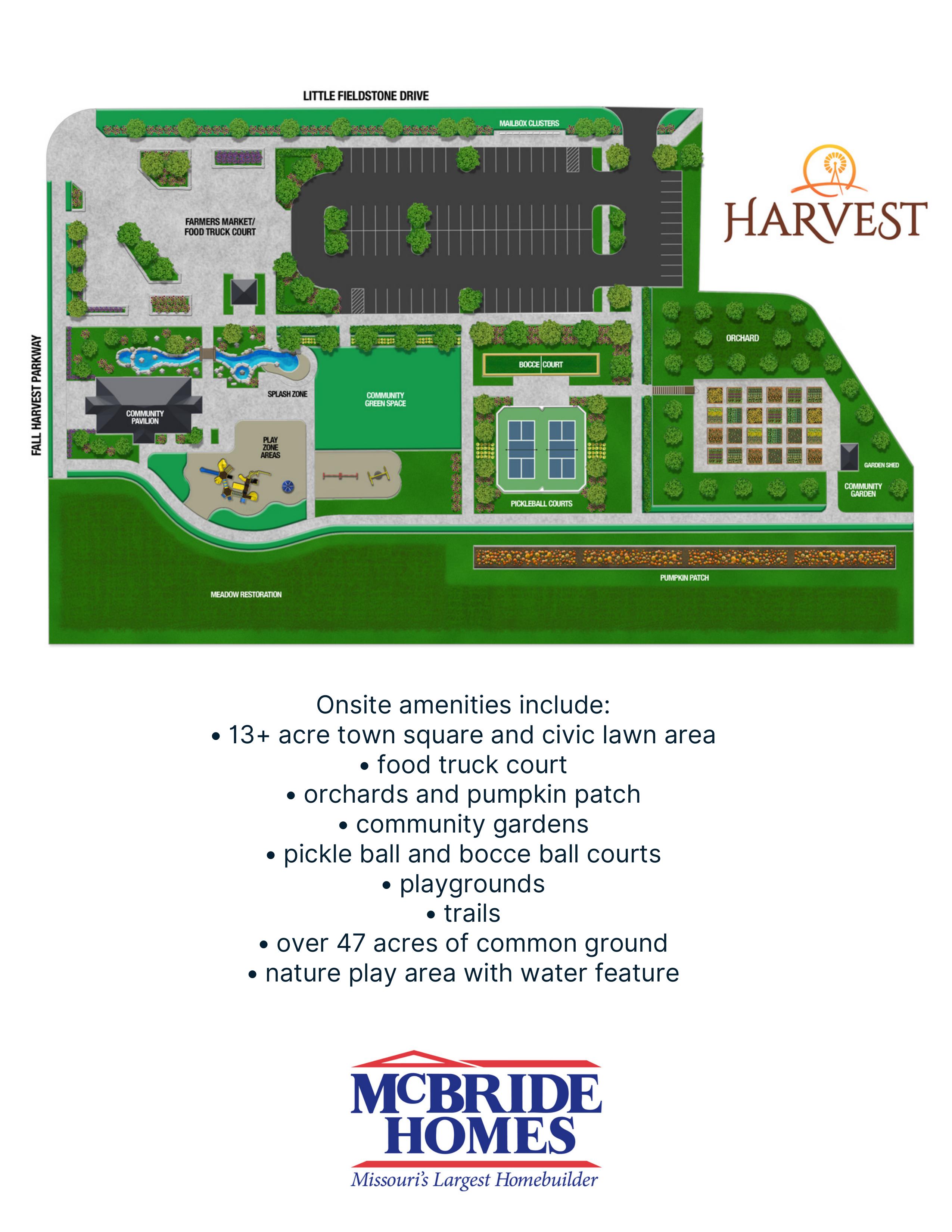 Harvest will offer incredible onsite amenities in O’Fallon, MO featuring over 47 acres of common ground, nature play area with water feature, 13+ acre town square and civic lawn area, food truck court, orchards and pumpkin patch, community gardens, pickle ball and bocce ball courts, playgrounds, trails, and more!