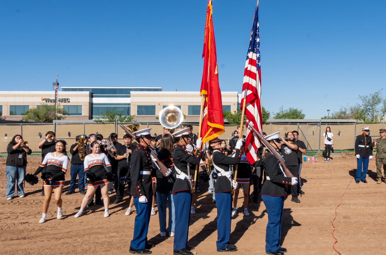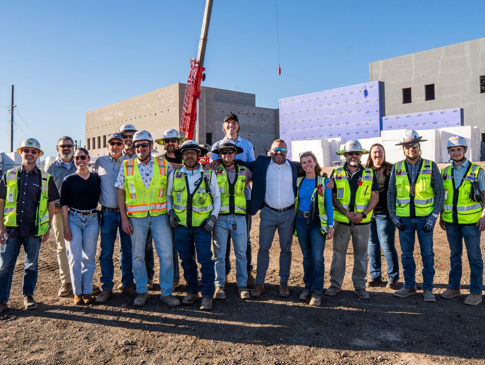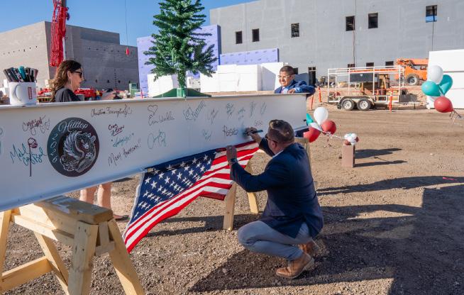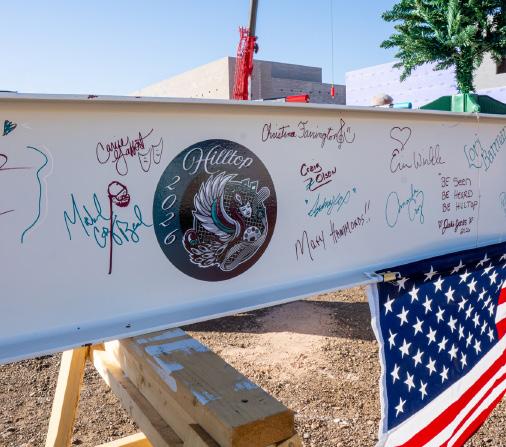 Agua Fria High School District’s new arts-focused high school recently celebrated its structural topping out with a beam signing. With the school’s future teachers and administrators in attendance, this event celebrated how integral community support was in bringing this project to life. As the beam was lifted into place, Superintendent Craig Olson shared the meaning behind the milestone and the Christmas Tree tradition.