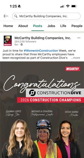 McCarthy’s NBDM meeting brought partners from across the company together in Phoenix, celebrating the success of $12.2 billion in sales in 2025 and the collective effort it took to reach this milestone. The theme of this year’s conference, Every Piece Has Purpose, highlighted how each partner contributes to the bigger picture, inspired by the an Arizona classic; the mosaic. Over two days, partners connected, shared best practices, and explored the UNIFY imperative and its impact on daily work. Discussions focused on the pursuit process and ways to drive better alignment across the company. Highlights included a president’s panel with regional leadership and a client panel with external partners, offering valuable insights and perspectives. Outside of the conference sessions, partners enjoyed time in downtown Phoenix and at an offsite dinner at 810 Entertainment, strengthening relationships and building connections in a relaxed setting. A special shoutout goes to Senior Marketing Manager Abby Godfrey, who spearheaded the planning and coordination of this event.