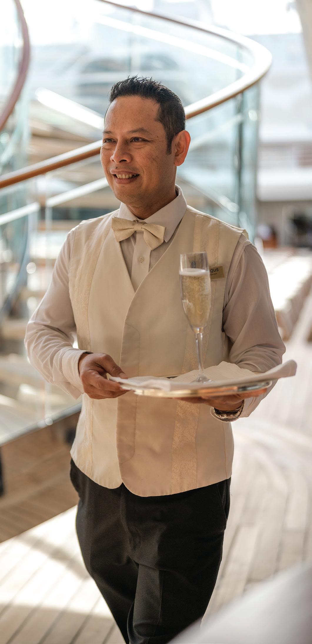 An Bord werden sowohl die Abende als auch die Tage auf See mit besonderen Momenten gefüllt sein, bereichert durch unsere herzliche Gastfreundschaft, die üppige Eleganz unserer Decks und Lounges sowie die Künste unserer erfahrenen Köche.