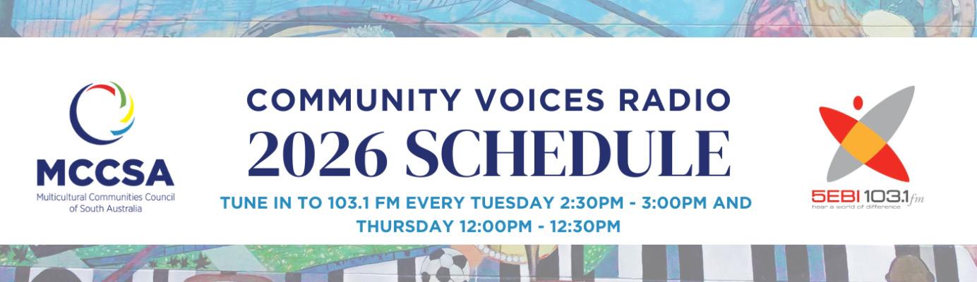 The Multicultural Communities Council of South Australia (MCCSA) is partnering with 5EBI Multicultural Radio to offer multicultural community groups (MCCSA Members) the opportunity to participate in the Community Voices Radio Program, broadcasting from 5EBI studios at 10 Byron Place, Adelaide SA 5000.