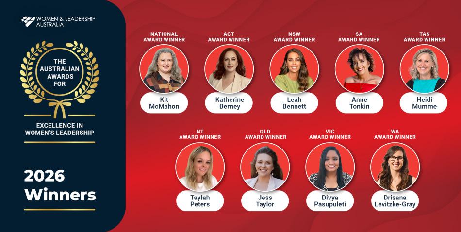 The state winners reflect the remarkable depth of leadership across the country: Taylah Peters (NT), Leah Bennett (NSW), Jess Taylor (QLD), Katherine Berney (ACT), Anne Tonkin (SA), Divya Pasupuleti (VIC), Drisana LevitzkeGray (WA), and Dr Heidi Mumme (TAS).