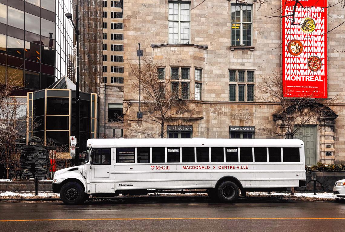 The inter-campus shuttle—a connection for students to and from the downtown and Macdonald campuses—was established in the late 1990s. With a 45-minute bus ride instead of the hour-and-ahalf-long travel time of public transport, the shuttle has, since its creation, been the fastest and most affordable way for students to move between campuses.