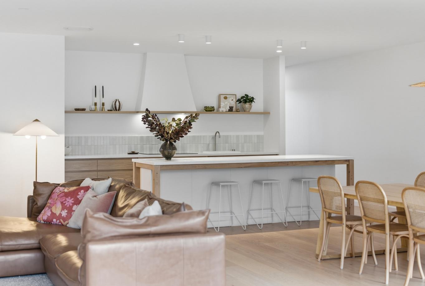 benchtops and a timber island bench paired with stone tiles on the feature bench create layers of texture throughout the space. Together, these elements bring warmth and character to the home, creating an environment that feels both inviting and connected to the outdoors.