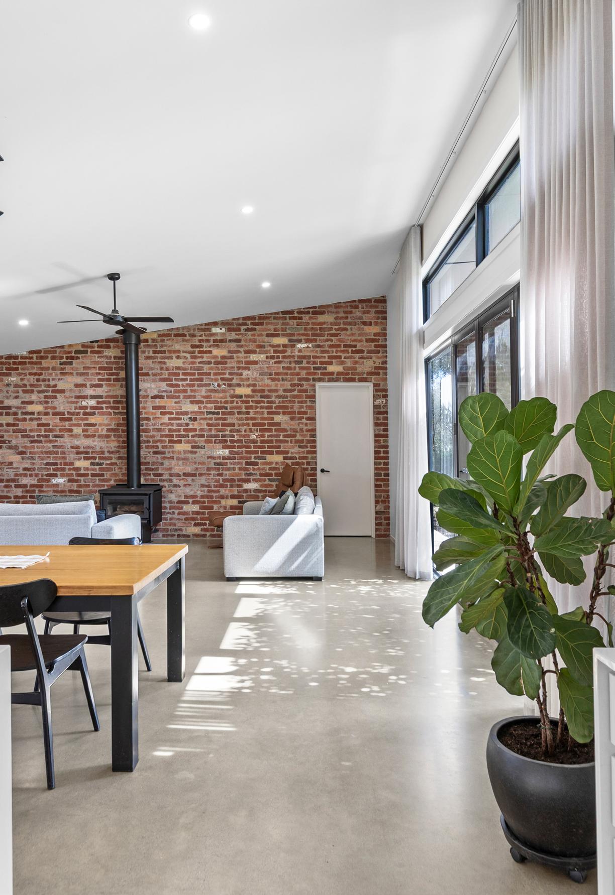 Inside, polished concrete floors, high ceilings and oversized doors establish a strong architectural presence, while large windows and skylights flood the home with natural light. The expansive open-plan living and dining zone forms the social heart of the home, warmed by a wood heater and complemented by a striking exposed brick feature wall. At its centre, the impressive kitchen showcases an oversized island, butler’s pantry, double ovens, induction cooktop and extensive storage, ensuring it performs as beautifully as it presents. A second living space and a purpose-built study nook add flexibility, while clever storage solutions, wide hallways and a thoughtfully designed powder room enhance everyday practicality.