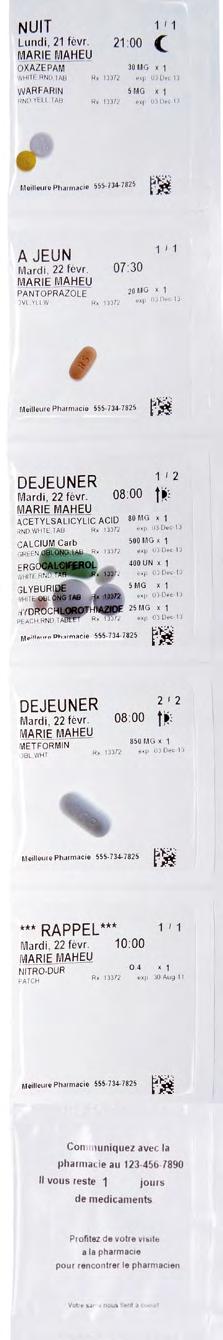 • Sachets personnalisés indiquant le jour et l’heure de la prise de chaque médicament (même si un médicament doit être pris plus de 4 fois par jour)