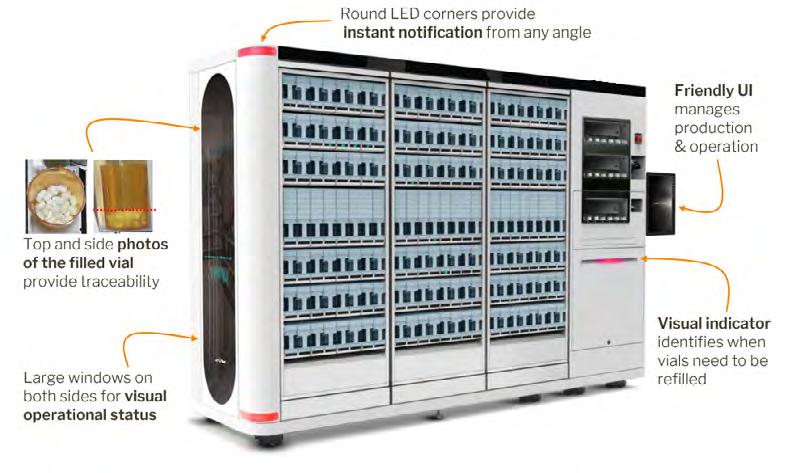• Deux bras robotiques multitâches permettent le remplissage, la photographie, l’étiquetage et le dépôt de flacons simultanés.