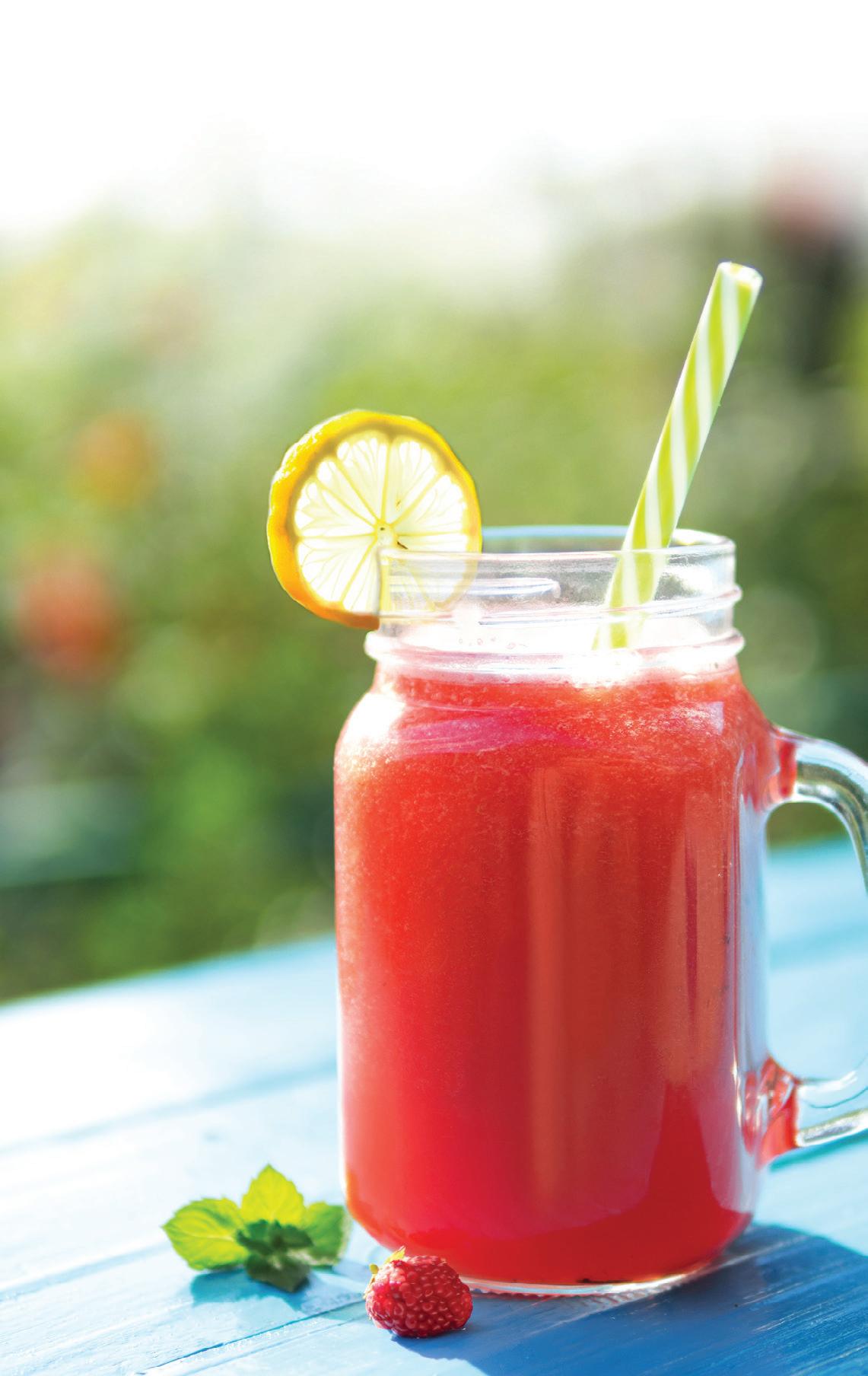 Strain the contents into a glass over crushed ice. Garnish with fresh mint, berries and lemon slice.