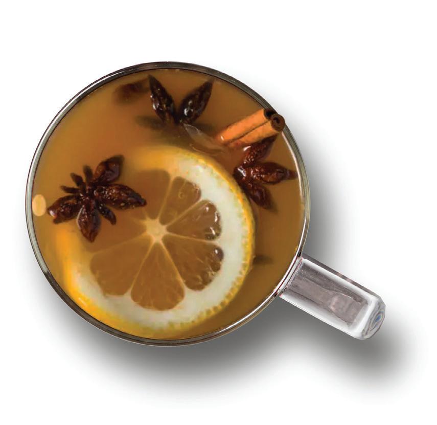 Overlooking Walker Pond, escape to a two-story treehouse. Unwind in the outdoor cedar tub and take in the beauty of the woods at this nature getaway. Built between a pair of white pines, the cabin includes a kitchen, living and bathroom space on the first floor and a sleeping quarters on the upper level with a cathedral ceiling of exposed cedar rafters. The inside and outside spaces blend together for a relaxing back-to-nature vacation. The spices of this mocktail are as relaxing, warm and cozy as your stay.