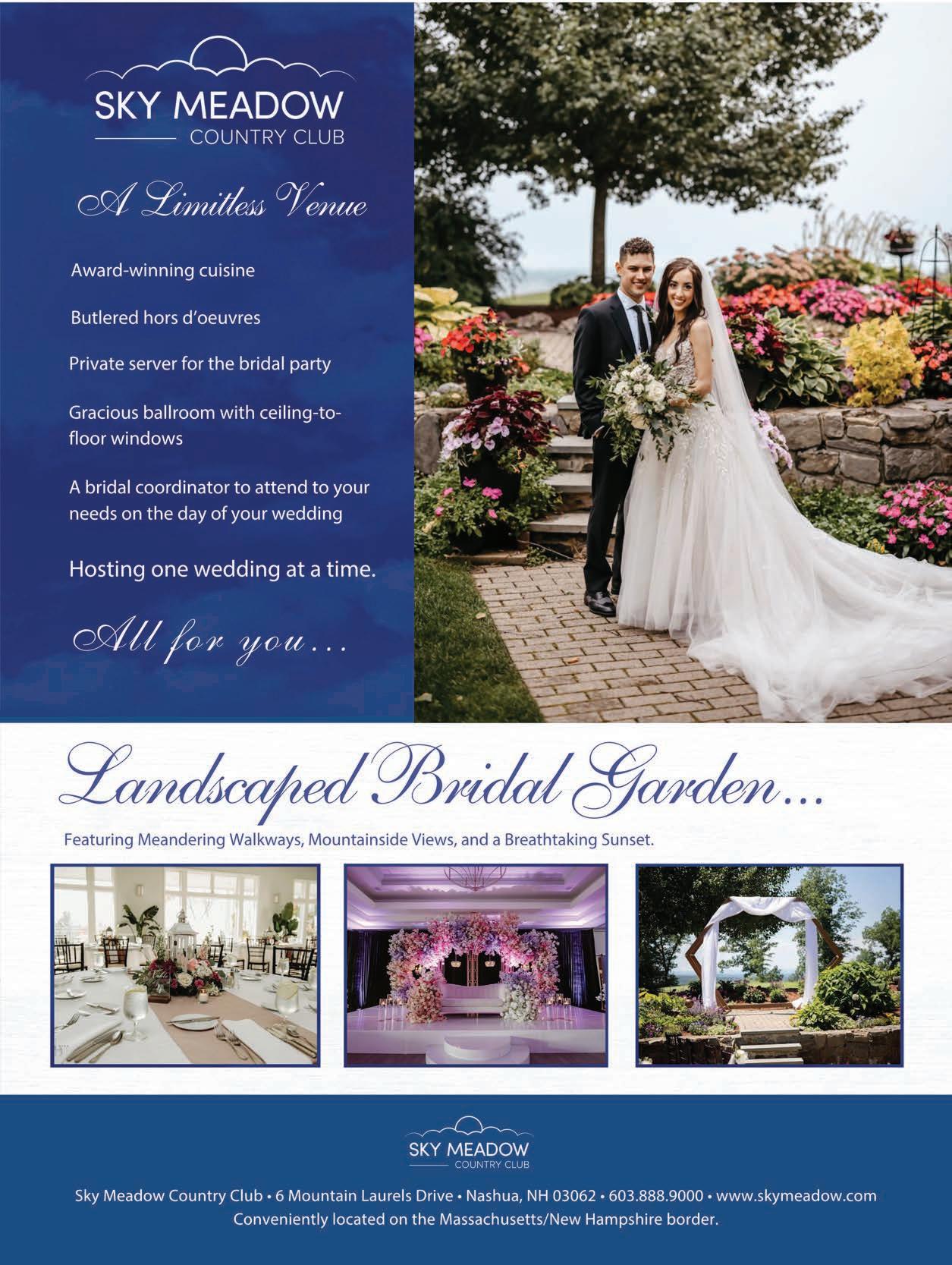 New Hampshire Magazine’s BRIDE® is published by Yankee Publishing, Inc., 250 Commercial Street, Suite 4014, Manchester, NH 03101, (603) 624-1442. All rights reserved. Reproduction in whole or in part without the written permission of the publisher is prohibited. The publisher assumes no responsibility for any mistakes in advertisements or editorial. Statements/opinions expressed herein do not necessarily reflect or represent those of this publication or its officers. While every effort has been made to ensure the accuracy of the information contained in this publication, Yankee Publishing, Inc.: New Hampshire Magazine’s BRIDE® disclaims all responsibility for omissions and errors. New Hampshire Magazine’s BRIDE® is published twice a year in March and October.