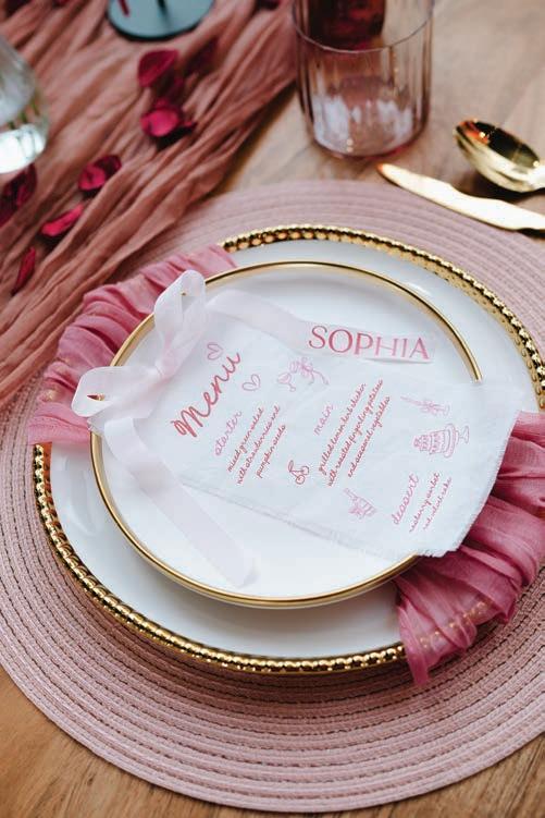Your bridal shower is for your girls to celebrate you—but what if you make it a Bridesmaidsmeets-Pink Ladies moment and celebrate them too? The Venue at the Factory in Manchester’s industrial-chic vibes, bistro lights and expansive ceilings create the perfect setting for a Galentine’s Day themed party. Blush scribblestyle signage, linen menus, bow details and a topping-stocked ice cream cart round out the day celebrating love, friendship and gathering in style. thevenuesatthefactory.com, @venuesatthefactory