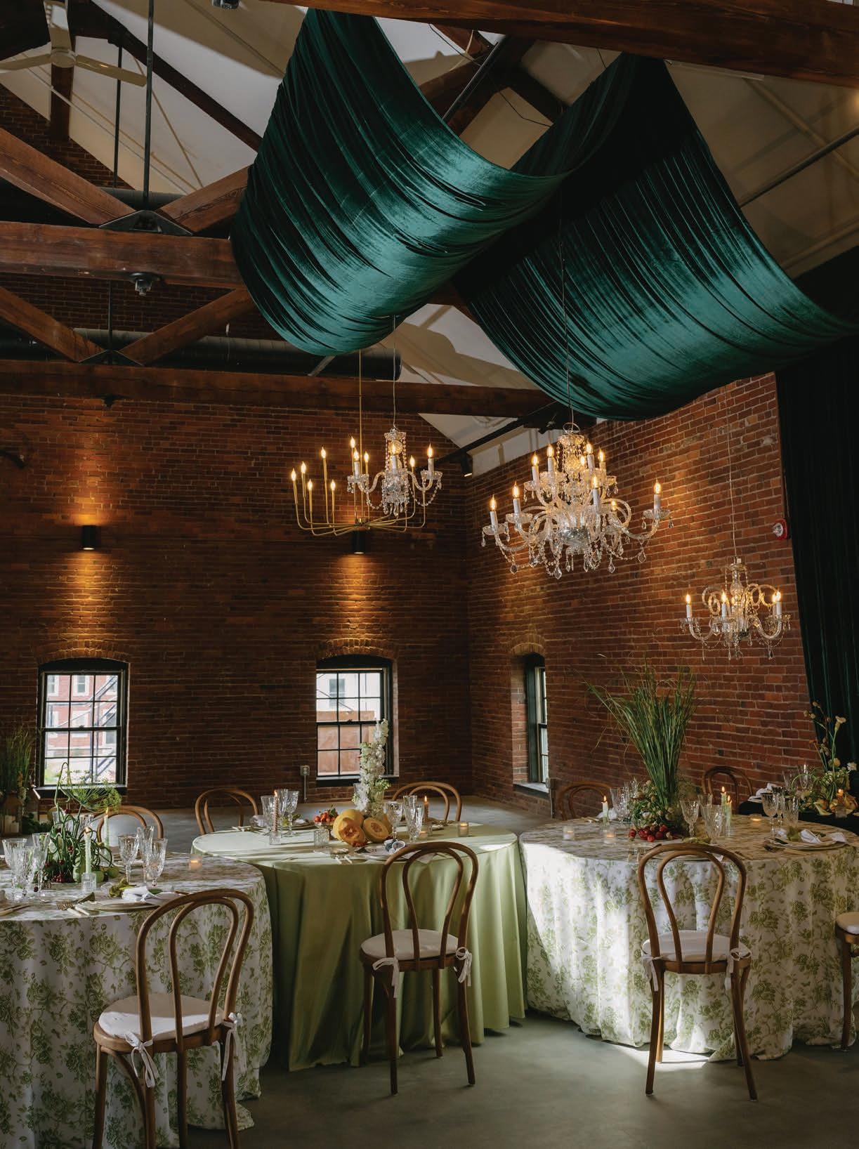 Customize your wedding space by adding draping to show off the elements you love and hide the ones you don’t. Use eye-catching bold prints or jewel tone velvets like this backdrop by Griffin Griffin Lighting to create a warm, intimate atmosphere reminiscent of a dinner party at home. griffingriffinlighting.com, @griffingriffinlighting