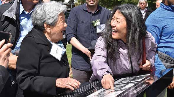 Harumi March (left) and Tammy Hamakawa-Iseri, the granddaughter of Mojiro Hamakawa, share joy in finding a family member in a photo at the Japantown Monument unveiling ceremony in Rotary Park.