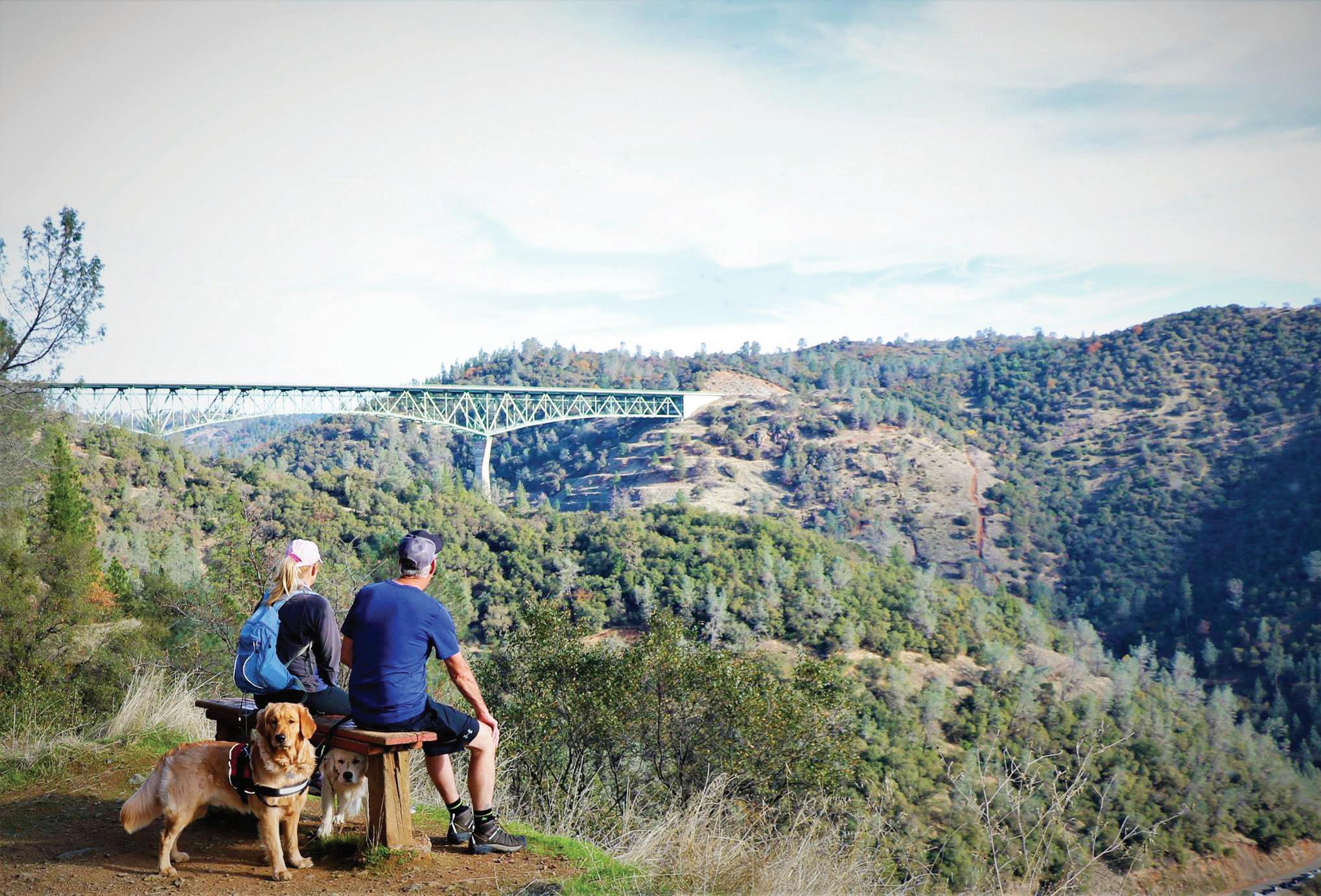The Manzanita Trail is aptly named. During or right after a rain, the bark of the manzanita is bright red. The hearty bush thrives along the trail and in a couple areas it is shaped into an arched trellis over the path. After connecting to Stagecoach Trail the path opens providing views of the Foresthill Bridge, the tallest bridge in California at 731 feet. The Confluence Bridge, Old Foresthill Bridge and the Highway 49 bridge are all within view. If you look to the far right you can see the Mountain Quarries Railroad Bridge.