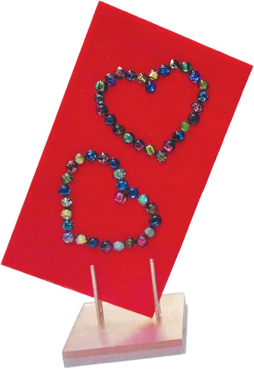 She attaches her glass abstracts to a stand to set on a surface; however, some of her artwork can hang on a wall or in a window. She makes other unique pieces such as glass clocks, layered bowls and novel designs made with di erent glasses that react chemically together to produce varied colors and shapes. She joins strips of glass in a basket weave pattern to make an “Iridescent Warp.”