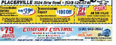 A local marketplace to find what you are looking for…To post your message, call us at 530-622-1255, Monday - Thursday, 8 a.m. - 2 p.m.; Friday 8 a.m. - 2 p.m. For Rent PLACERVILLE-$1.00 a square foot, includes utilities, 200sf –720sf each, office, storage, light industrial? 4600 Missouri Flat Rd, (530) 622-2640 HOUSE FOR RENT 3 BR, 2 ½ BA, 1200+ Sq. Ft. Washer/Dryer, Fridge, Central Heating & Air. Newer build, close to town. $2150, First + Deposit. No smoking, no pets. 916-505-5202