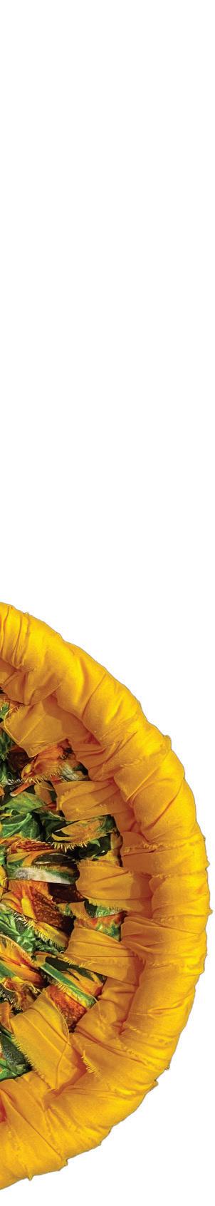 One of the results is “Sunflower Wall Baskets,” a fiber arts sculpture, glowing with sunny golds and yellows interspersed with a cheerful fabric print of greens and browns to give a feeling of happy sunflowers waving in the breeze. Part of the golden-yellow core she used for the coil is left exposed as a delightful attribute, joining the two baskets, one large and the other smaller, ready to be hung on a wall or set as a centerpiece on a table.
