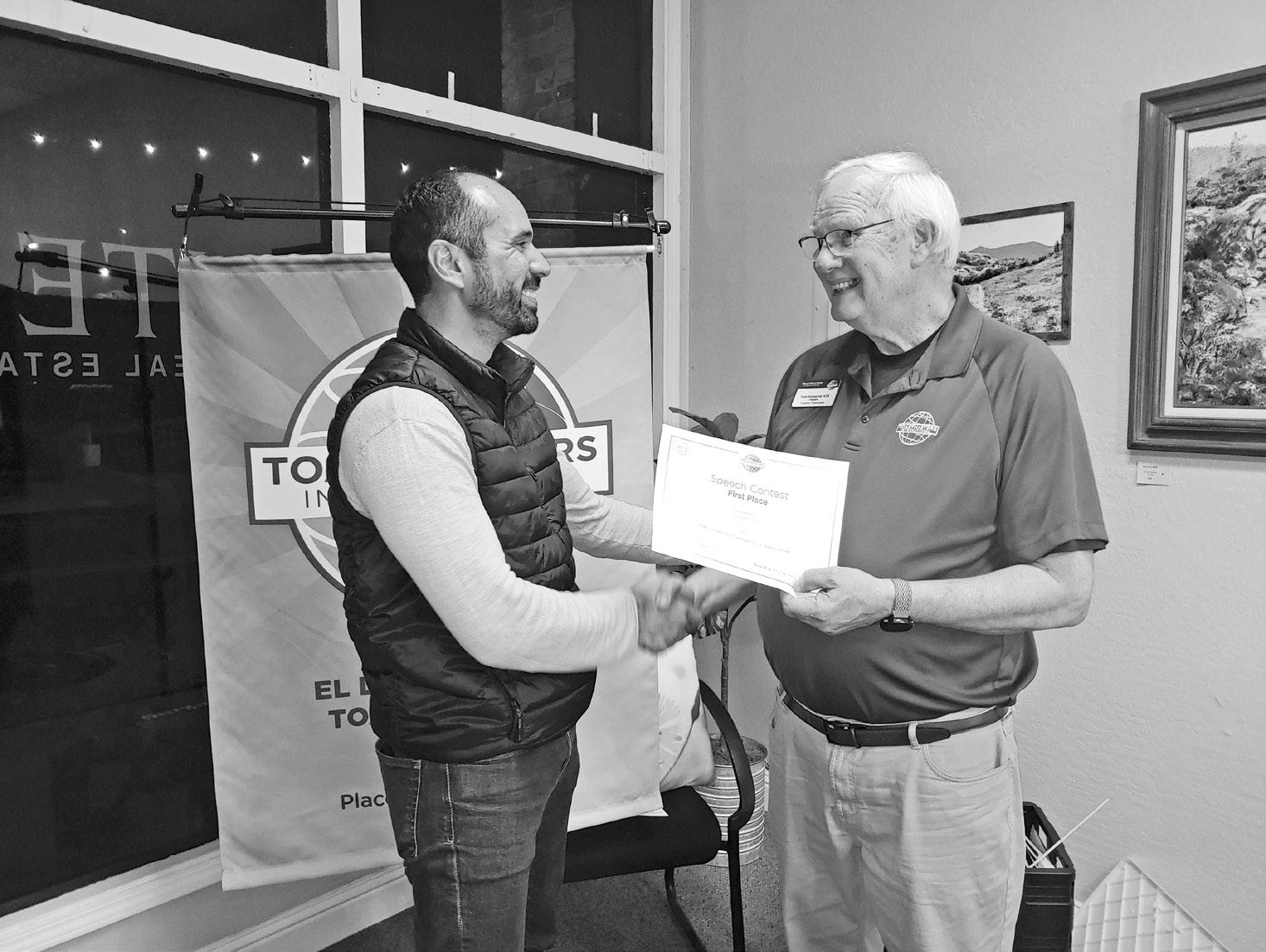 El Dorado Gold Toastmasters Club selected Carlos Catro Conde to advance to the area speech contest set for March 22. Conde, left, receiving recognition from club President Frank Mosbacher, shared an award-winning speech titled “The Power of Thought.” The club contest is the first step in the annual Toastmasters International Speech Contest. Conde, a Placerville resident and project manager, has been a member of El Dorado Gold Toastmasters for more than a year.