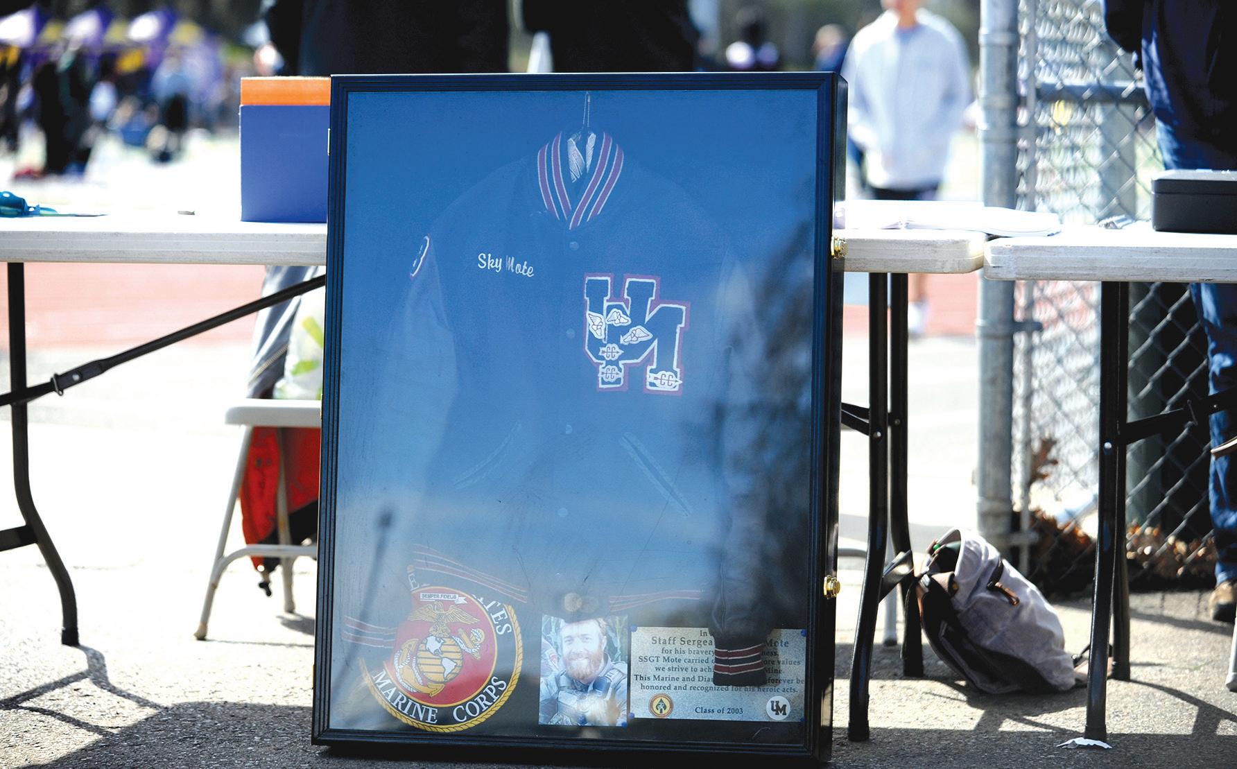 Cadet Corps Battalion 369 salutes at the Diamondbacks’ home track and field invitational that was named in honor of Staff Sgt. Sky Mote who was killed in the line of duty in Afghanistan 2012. Union Mine track and field coaches decided to name the school’s first invitational after the 2003 Union Mine graduate, who ran on the Diamonbacks’ cross-country and track and field teams.