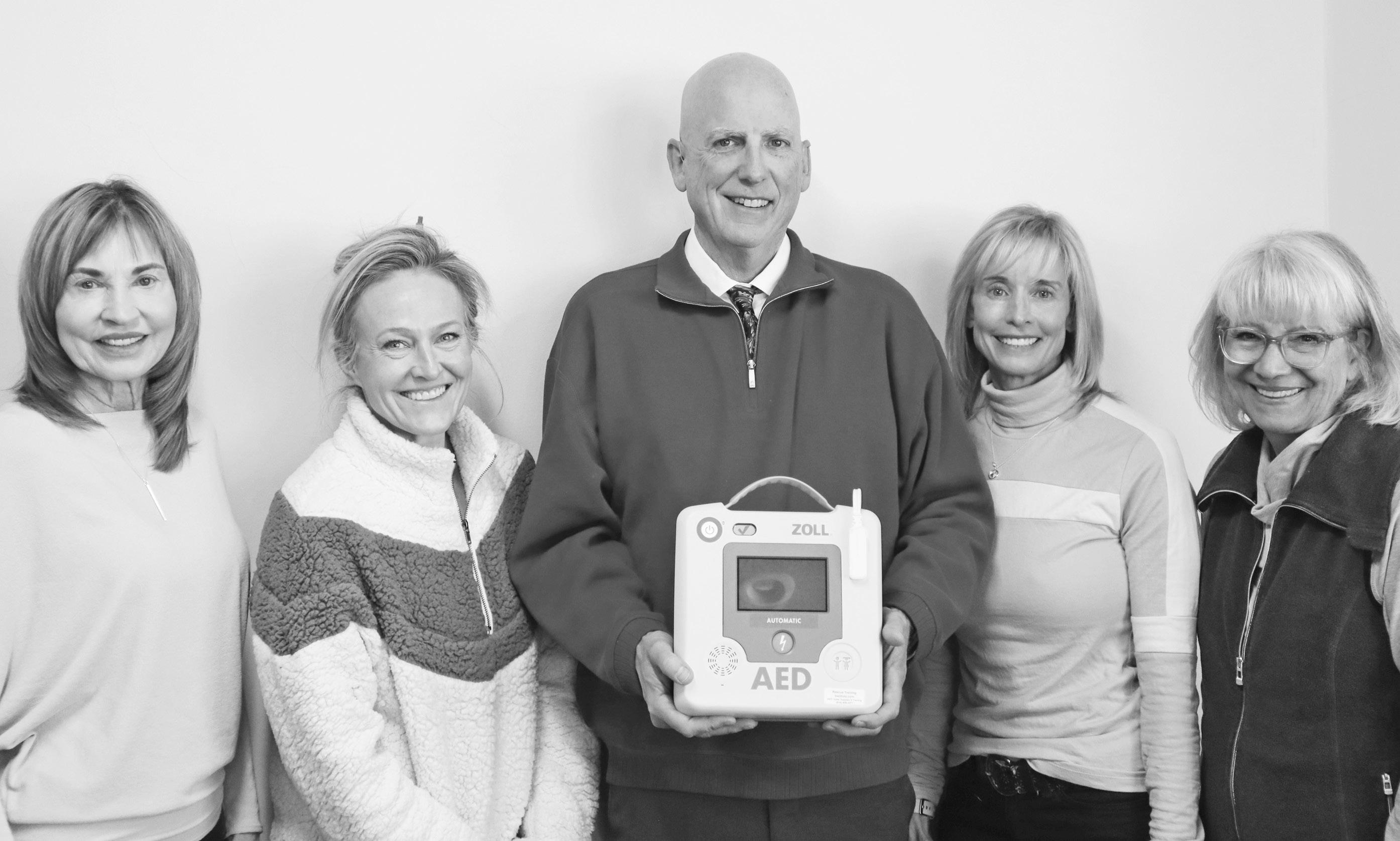 Ruby Turner, Melanie Turner, Julee Delacour and Marsha Ticas of the Barton Health Foundation pose with Pat Harnett, LTUSD coordinator, center, with an AED donated to LTUSD by the Barton Health Foundation.