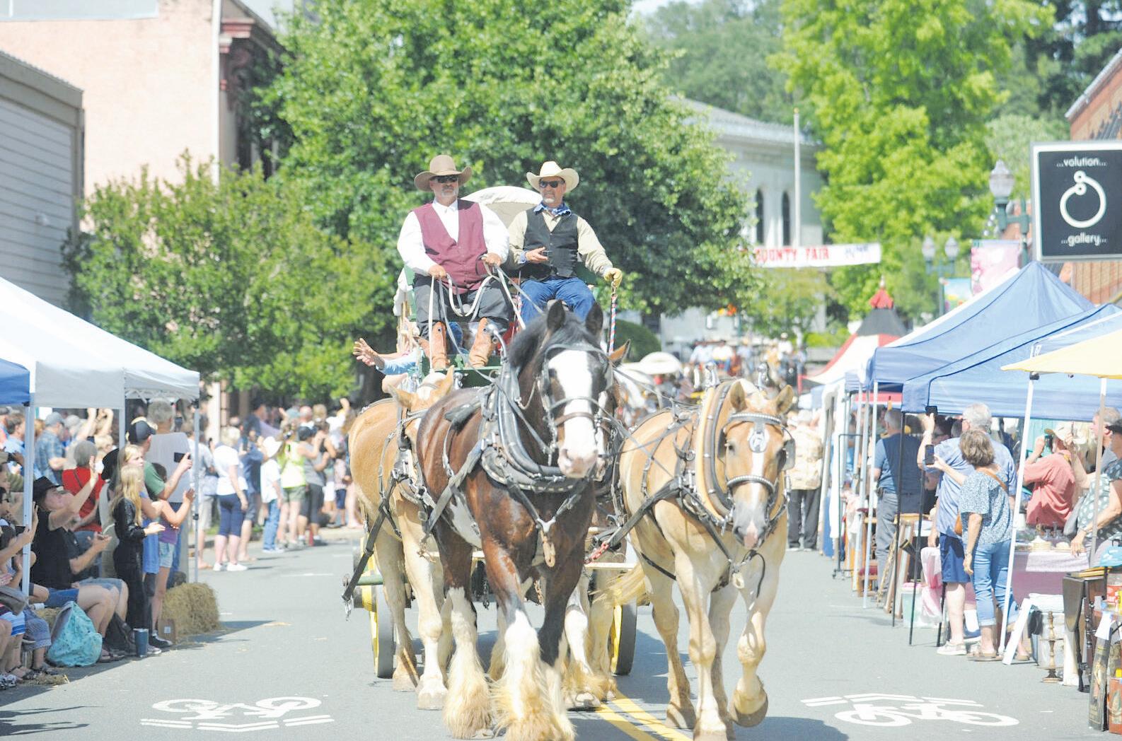 After a week of traveling over the Sierra Nevada from Round Hill, Nev., the Highway 50 Association Wagon Train came down Main Street in Placerville Saturday before completing its 75th annual trip. Visitors from far and wide lined the street to watch the horse-drawn wagons roll through the Golden History Day celebration. Though some wagons were pulled by normal-sized horses, the biggest ones were hauled by massive draft horses. The Hangtown Marshals, at right, were out in force Saturday, helping keep the streets clear and safe as the wagon train arrived.