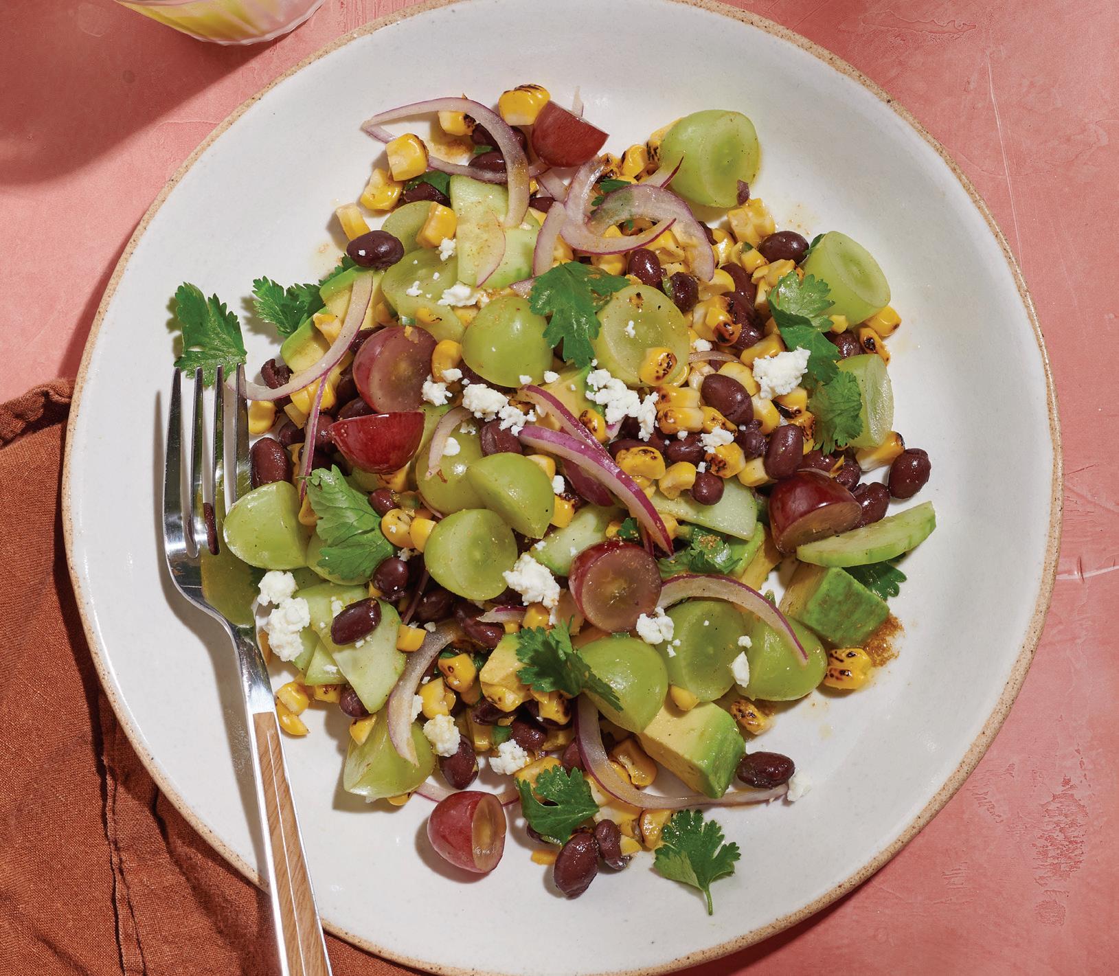 Add corn, avocado and cheese to bowl with grapeblack bean mixture. Sprinkle with pepper, to taste, and top with cilantro; toss well.