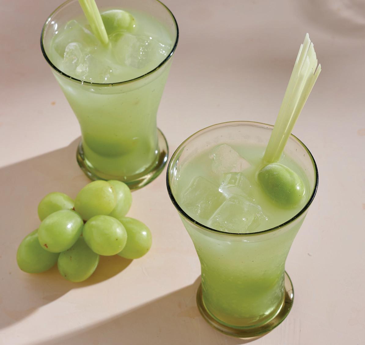 1/2 ounce lime juice frozen Grapes from California, for garnish lemongrass stalk, trimmed, for garnish