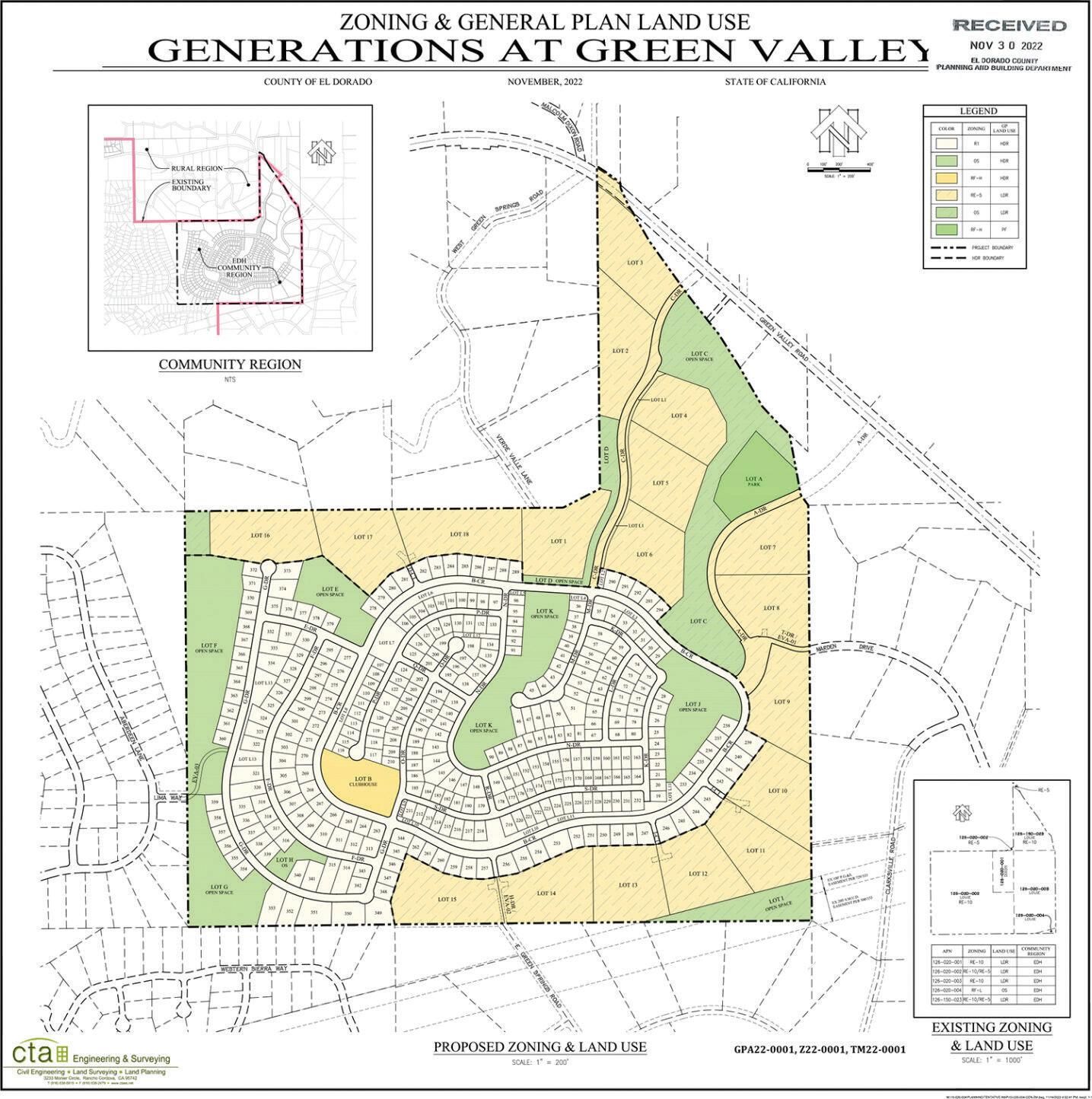 The Generations at Green Valley project proposes an El Dorado County General Plan amendment to amend the property’s land use designations from low-density residential to high-density residential, low-density residential and public facilities. The tentative subdivision map outlines plans to subdivide the approximately 280-acre site into 379 residential lots, a clubhouse lot, a park site lot, 13 landscape lots, nine open space lots and three lots for project roadways.