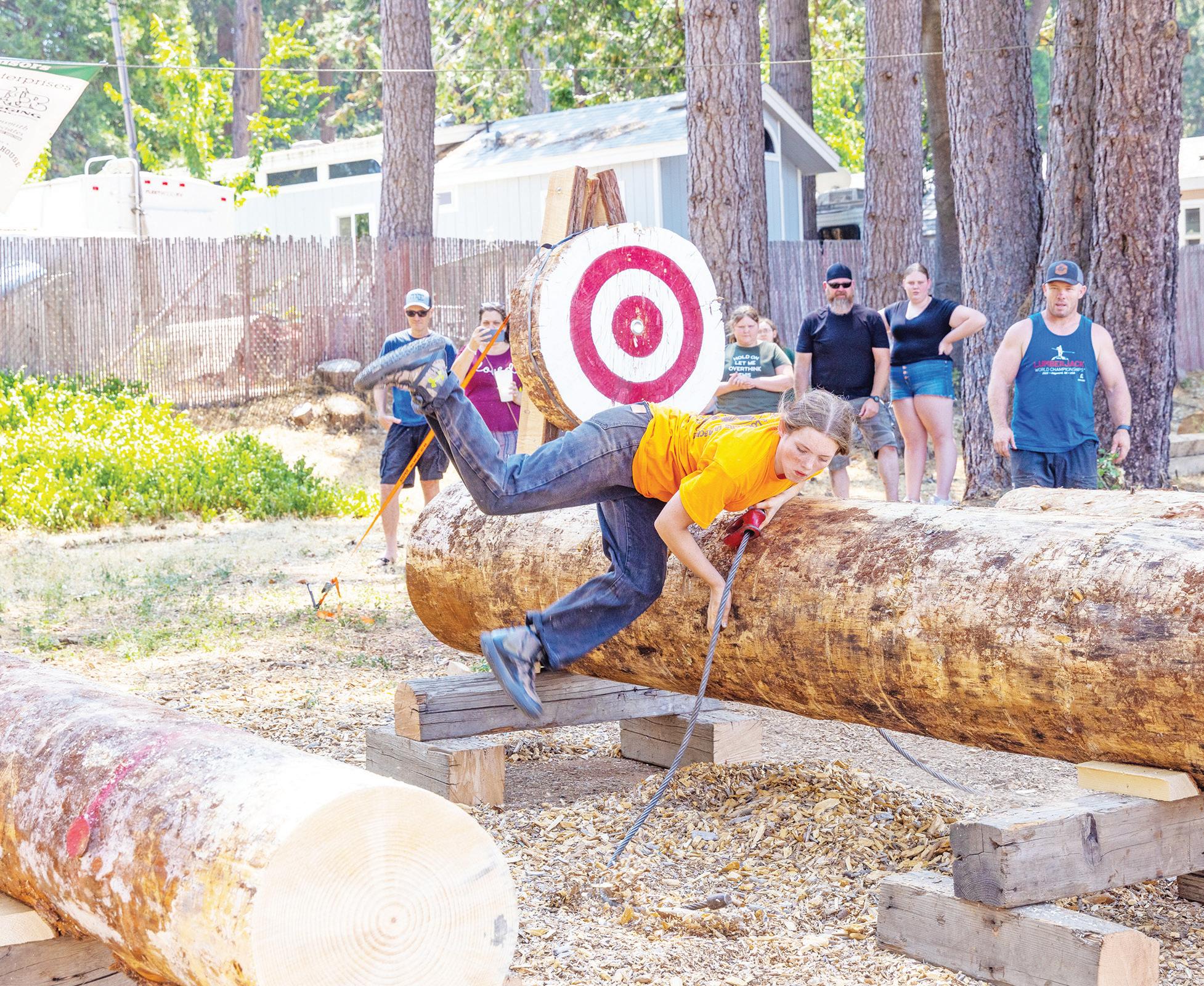 Logging days came back with a roar, a buzz and a whole lot of cheers at the Pollock Pines-Camino Community Center July 19 & 20. On Saturday competitors tested their skills in the axe throw, stock sawing, hot and double-buck sawing, pole climbing and chocker setting, among other games, as the crowd watched in awe. Tina and George Harrison Sr. of Grass Valley, above, compete in the Jack and Jill Bucking competition, finishing with a time of 11.32 seconds. Molly Hodges, 17, of Northfork, at right, hops over a log in the Choker Setting competition as her father, Nate, right, looks on.