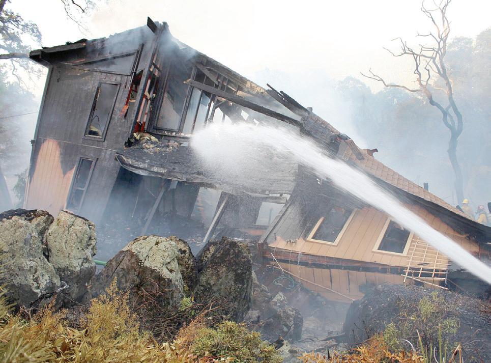 Photo courtesy of Diamond Springs-El Dorado Fire Protection District Firefighters blast water onto a home on Crystal Boulevard that was destroyed in a fire Sunday, July 30.