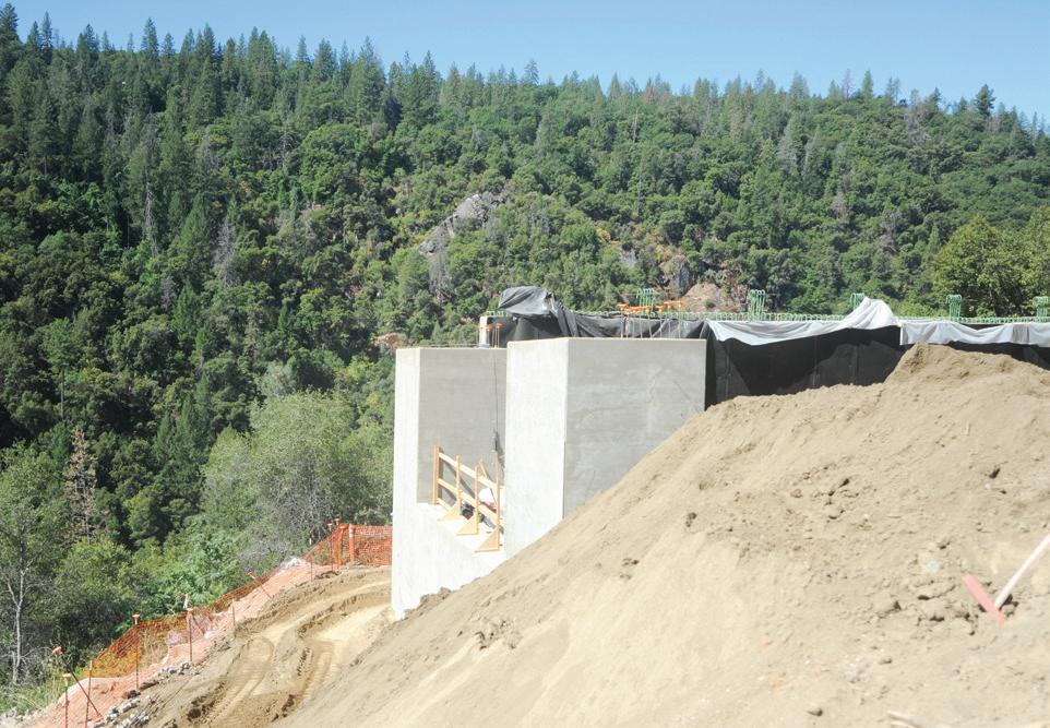 The bridge’s northern abutment wall is near completion and can be seen on the south side of the canyon above the South Fork of the American River.