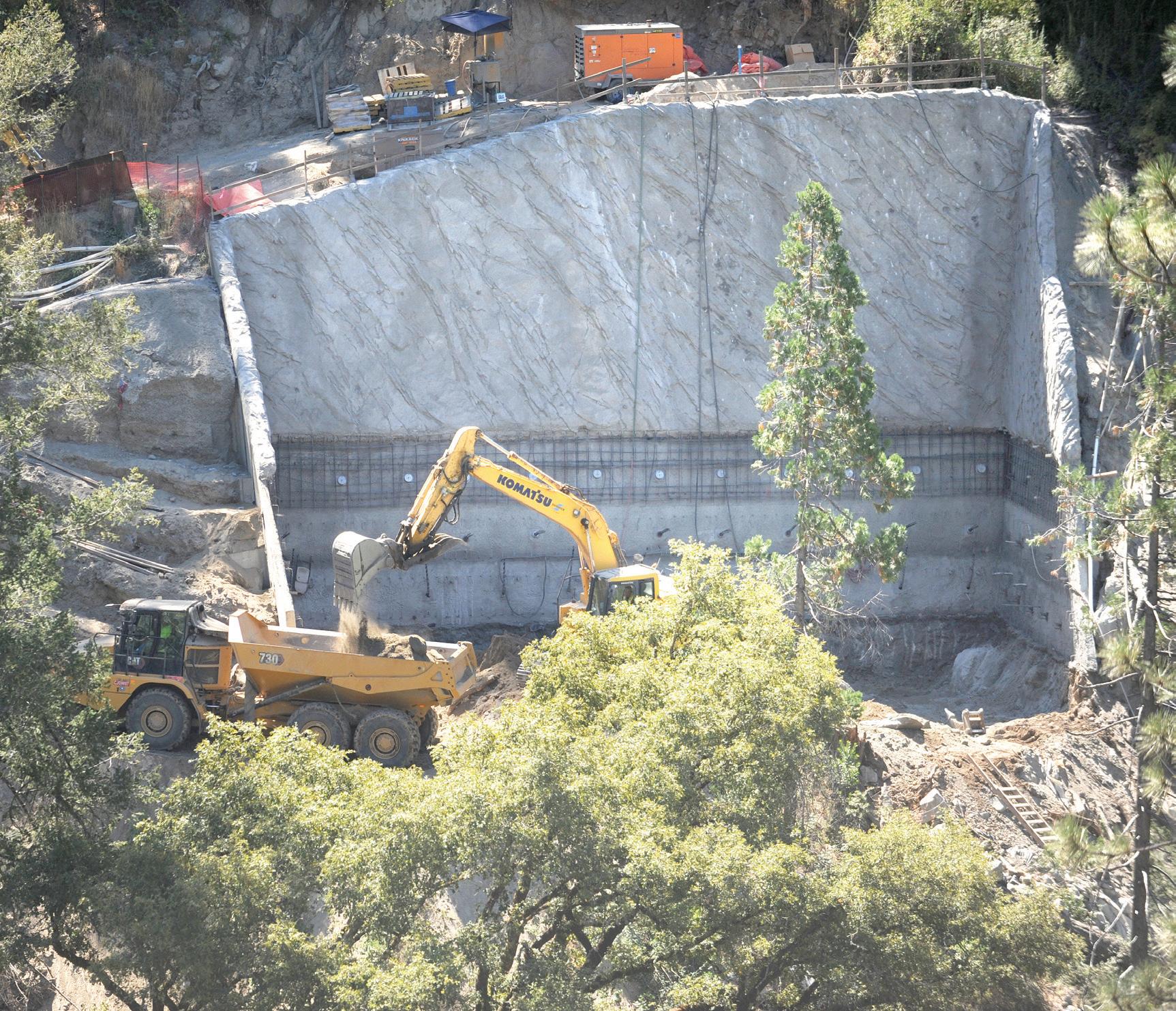 A reinforcement wall is constructed on the north side of canyon. Once completed, construction crews will begin building bridge piers.